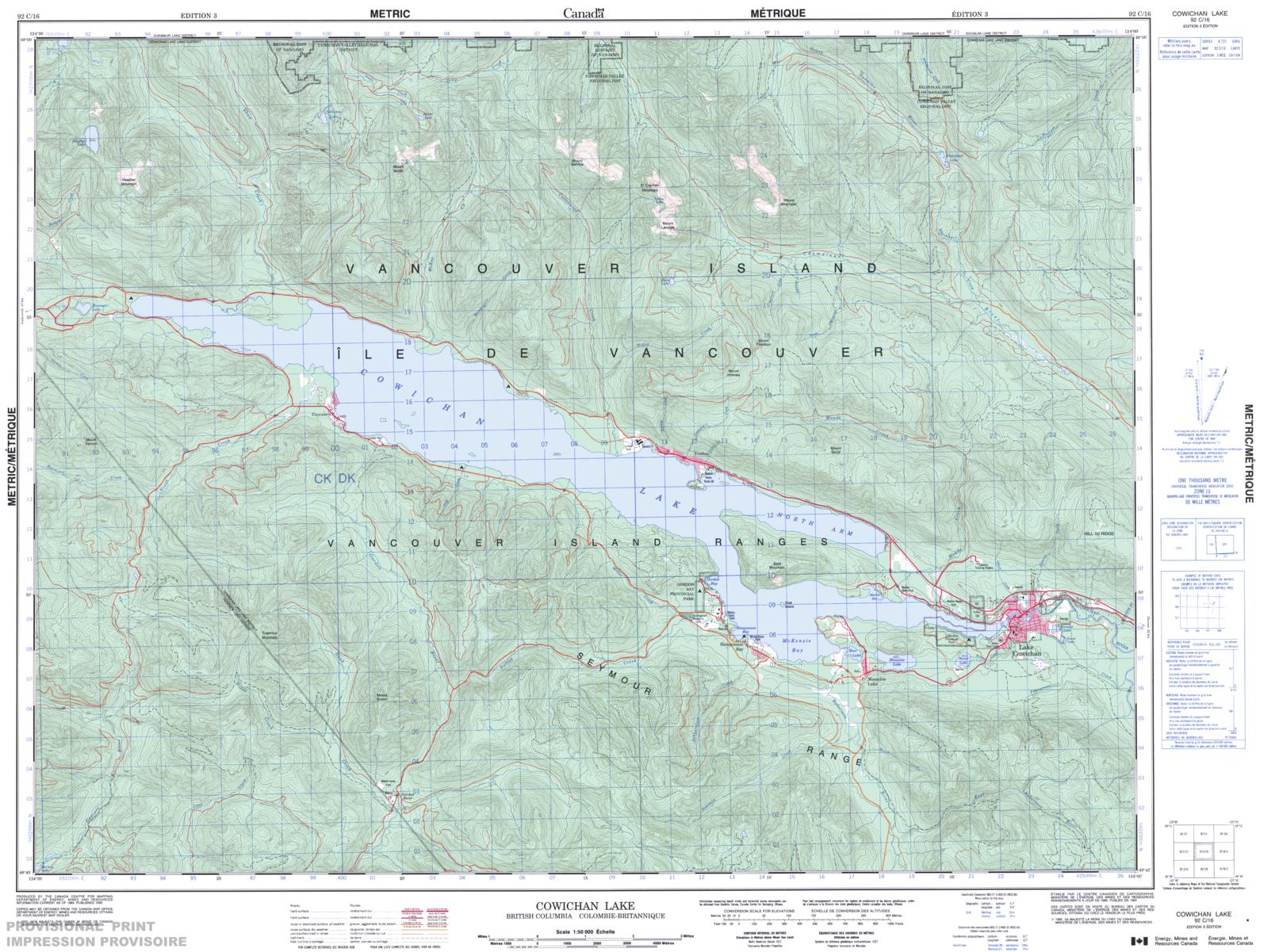Canadian topographic map of Cowichan Lake, British Columbia. NTS sheet 092C16 Edition 3.