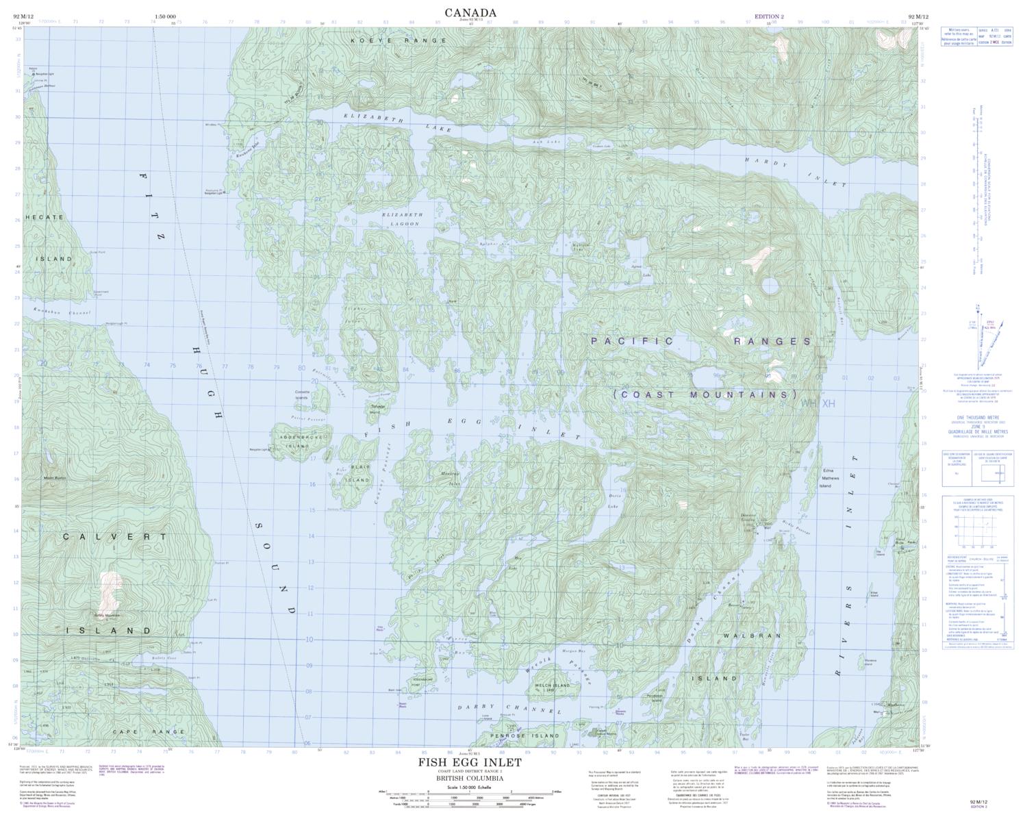 Canadian topographic map of Fish Egg Inlet, British Columbia. NTS sheet 092M12 Edition 2.