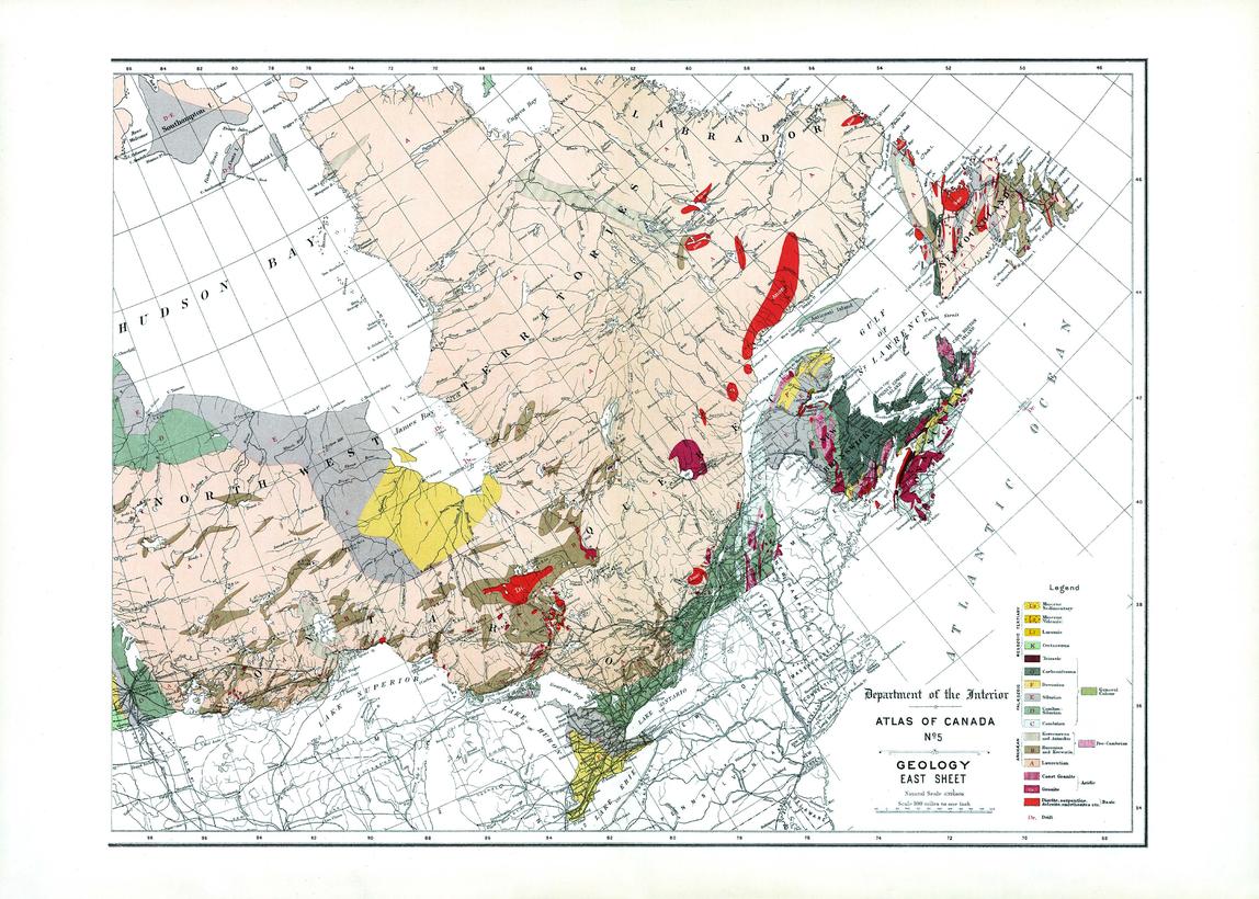Contained within the 1st Edition (1906) of the Atlas of Canada is a map that shows the geology and bedrock for Eastern Canada. The rock type era and period of formation are represented as letter codes and colour, in addition to indicating the surface coverage. The map emphasizes the extensive area in the Dominion that is occupied by the Archaean nucleus. It also includes major cities and railway systems.