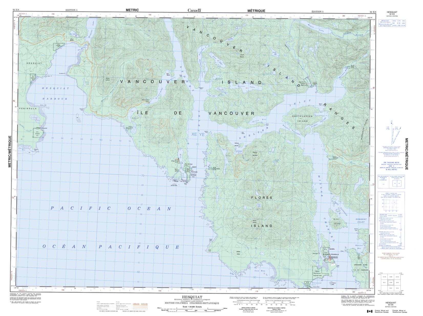 Canadian topographic map of Hesquiat, British Columbia. NTS sheet 092E08 Edition 5.