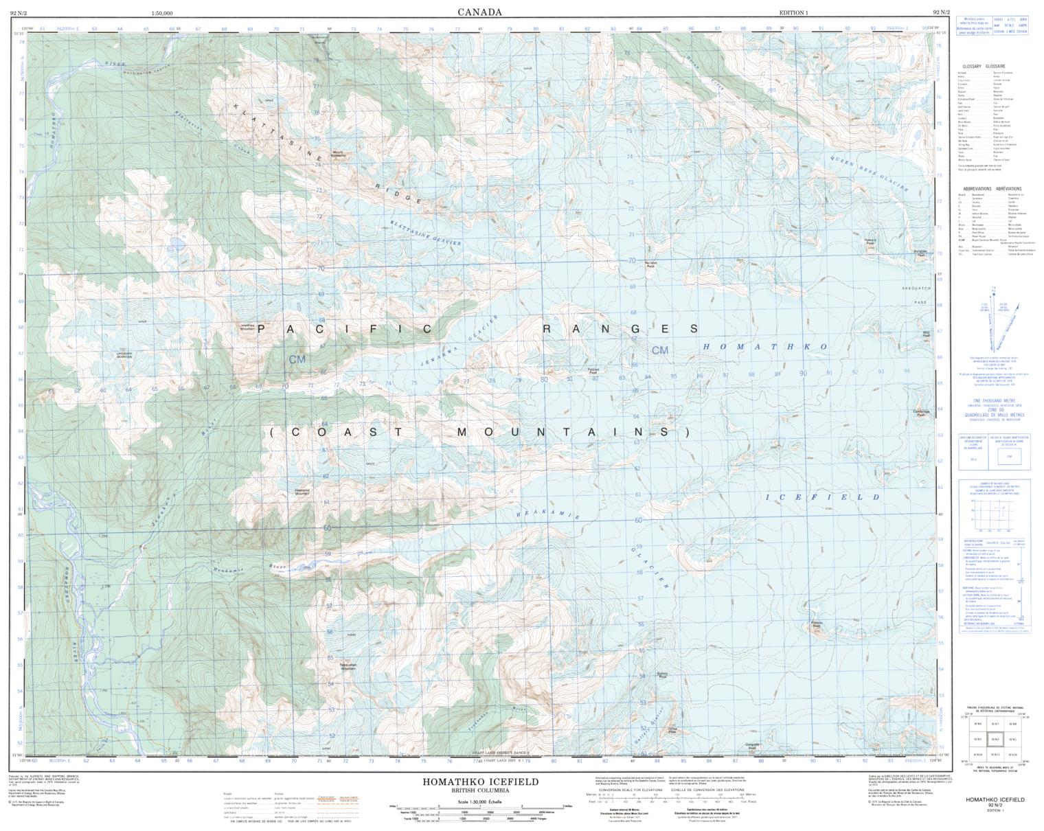 Canadian topographic map of Homathko Icefield, British Columbia. NTS sheet 092N02 Edition 1.