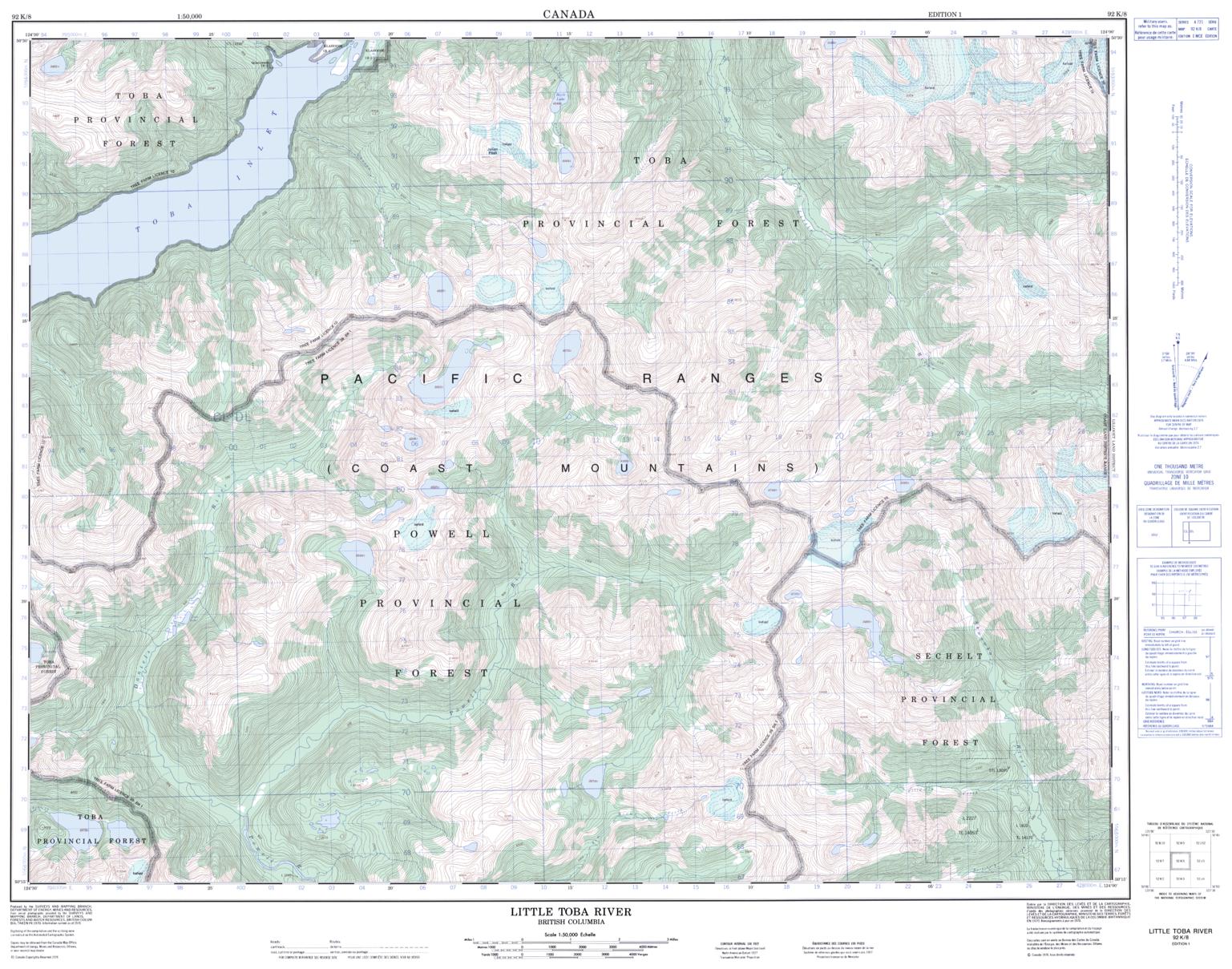 Canadian topographic map of Little Toba River, British Columbia. NTS sheet 092K08 Edition 1.