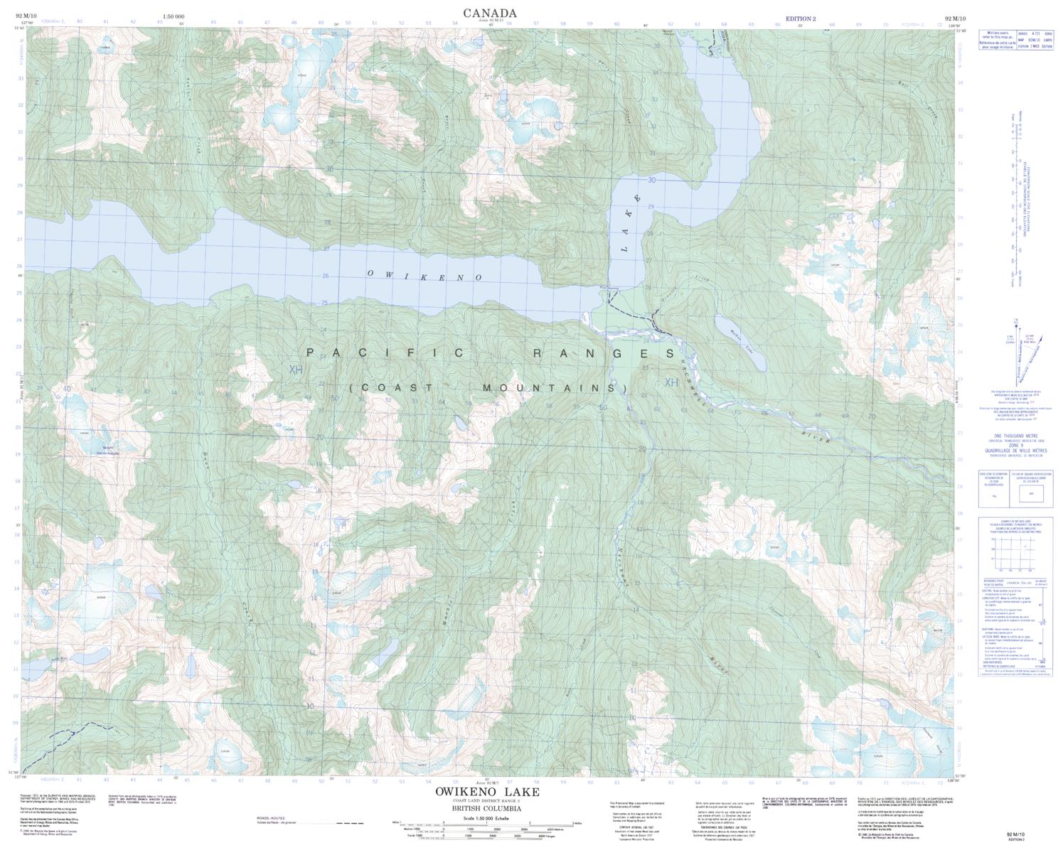 Canadian topographic map of Owikeno Lake, British Columbia. NTS sheet 092M10 Edition 2.