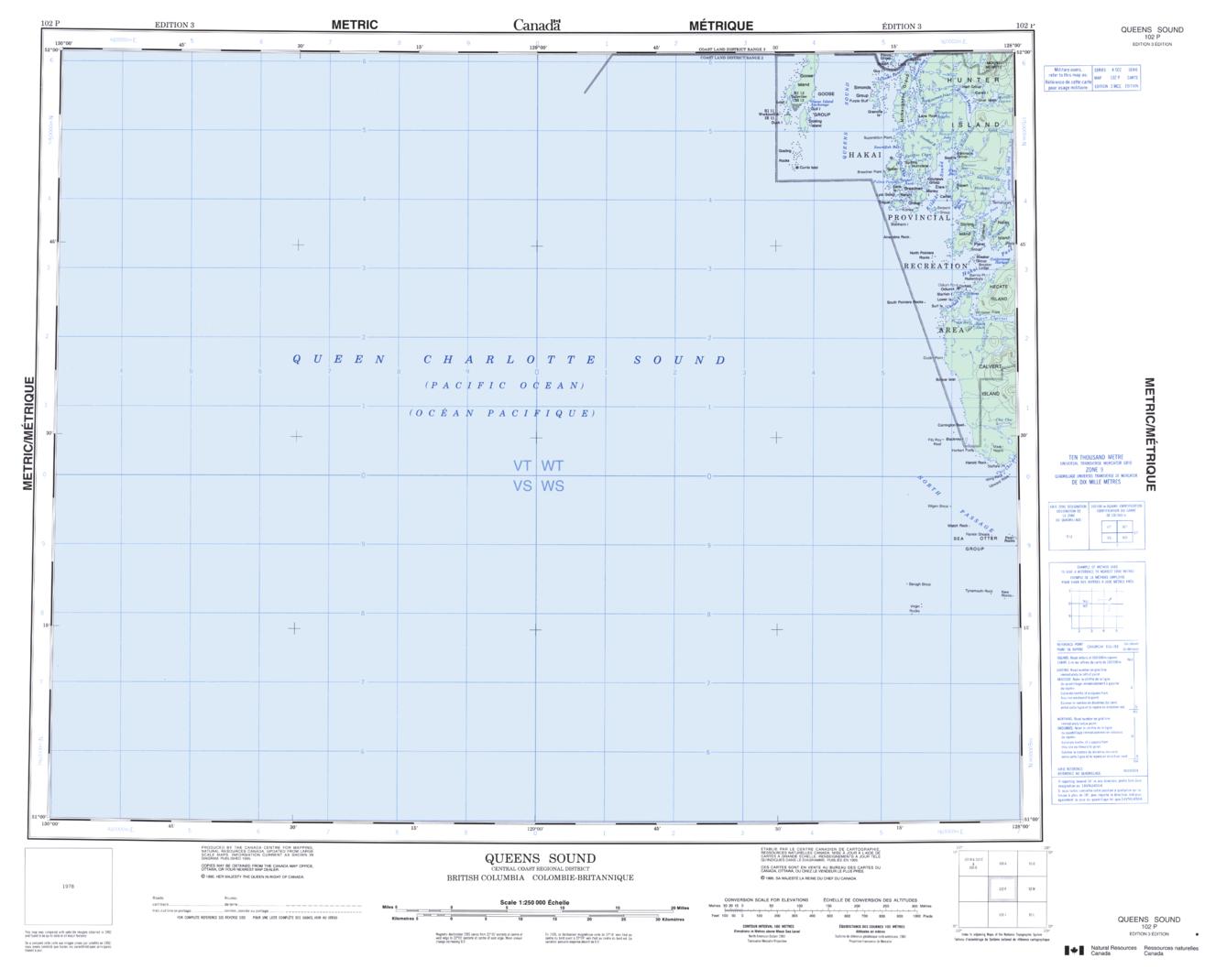 Canadian topographic map of Queen Sound, British Columbia. NTS sheet 102P Edition 3.