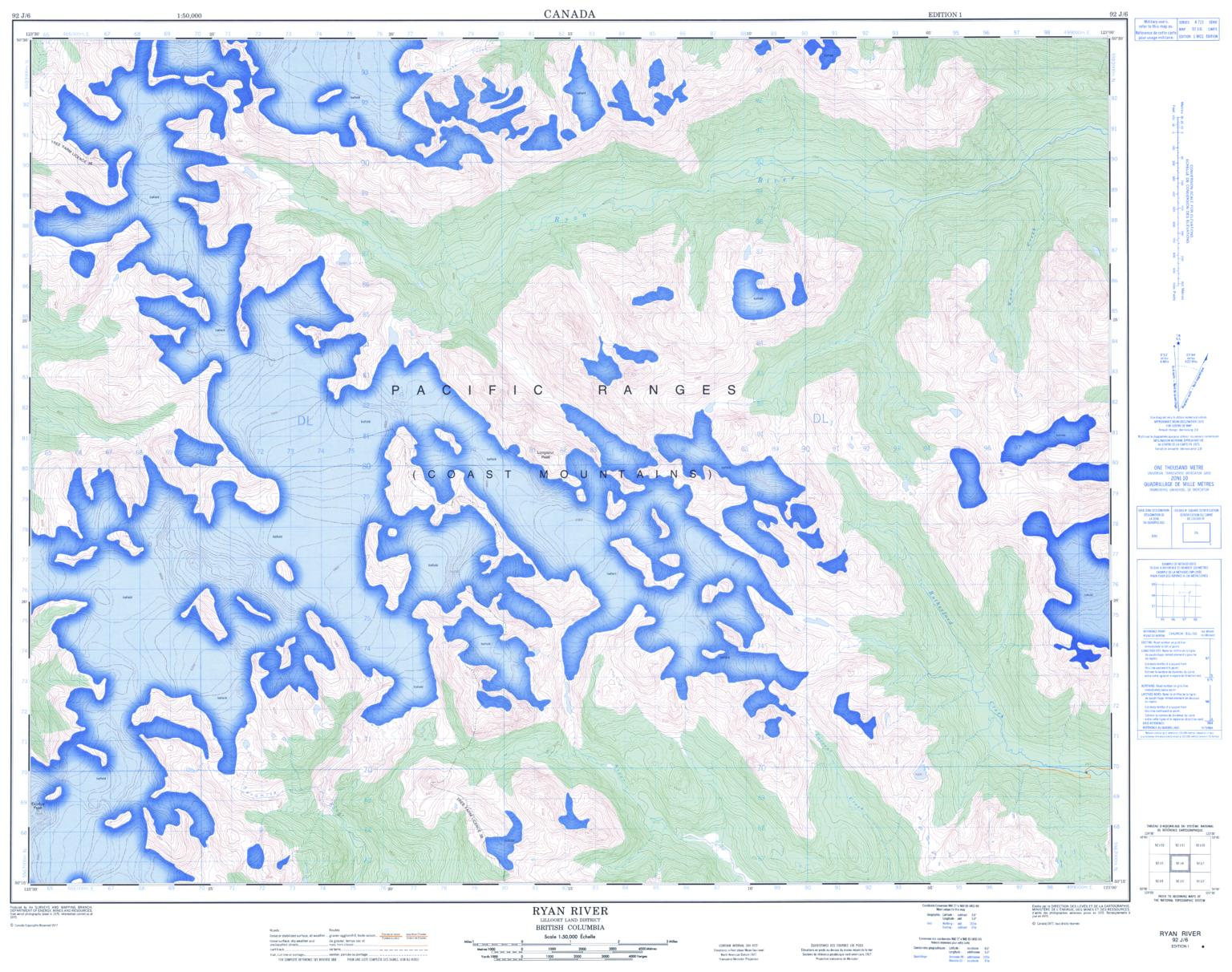 Canadian topographic map of Ryan River, British Columbia. NTS sheet 092J06 Edition 1.