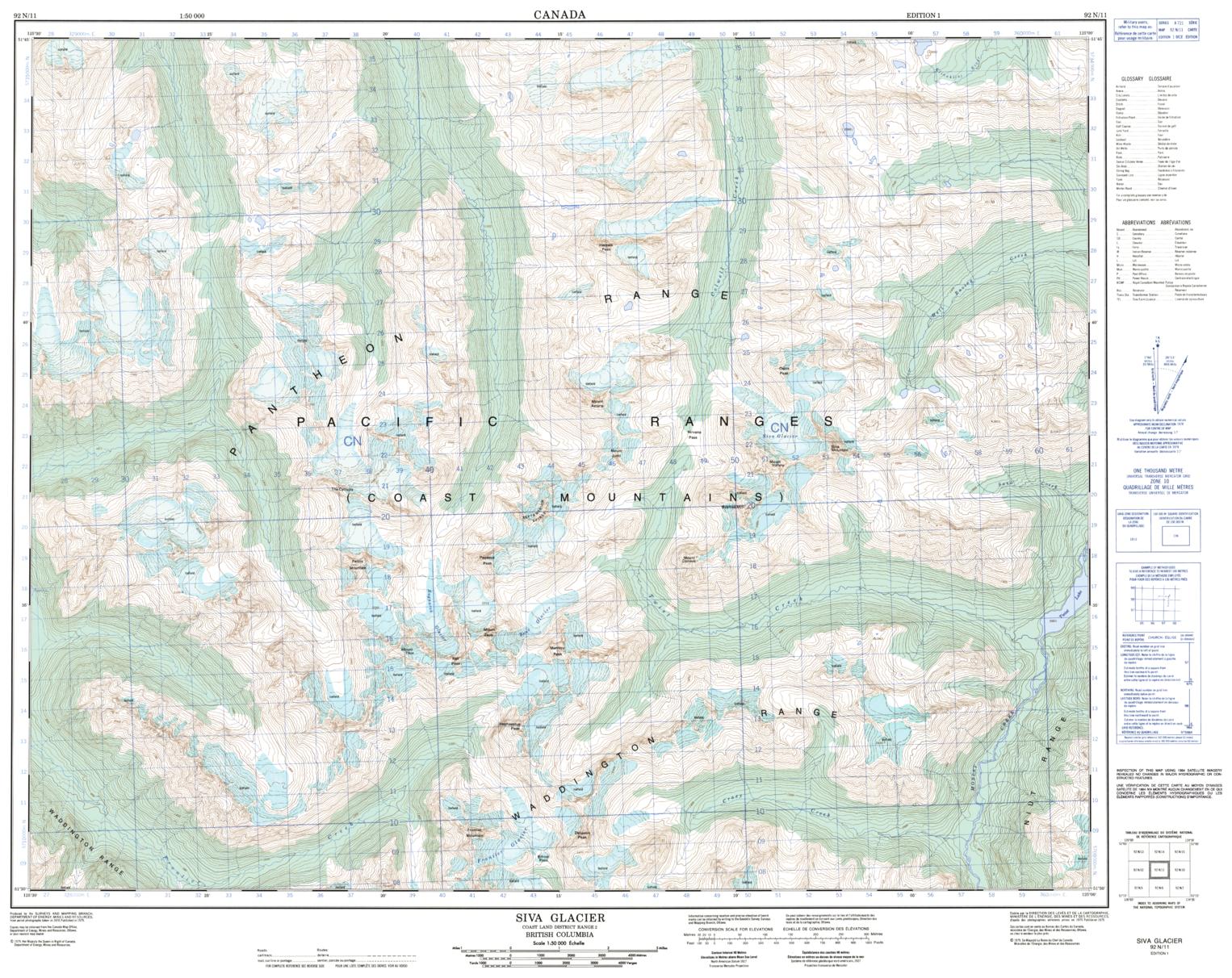 Canadian topographic map of Siva Glacier, British Columbia. NTS sheet 092N11 Edition 1.