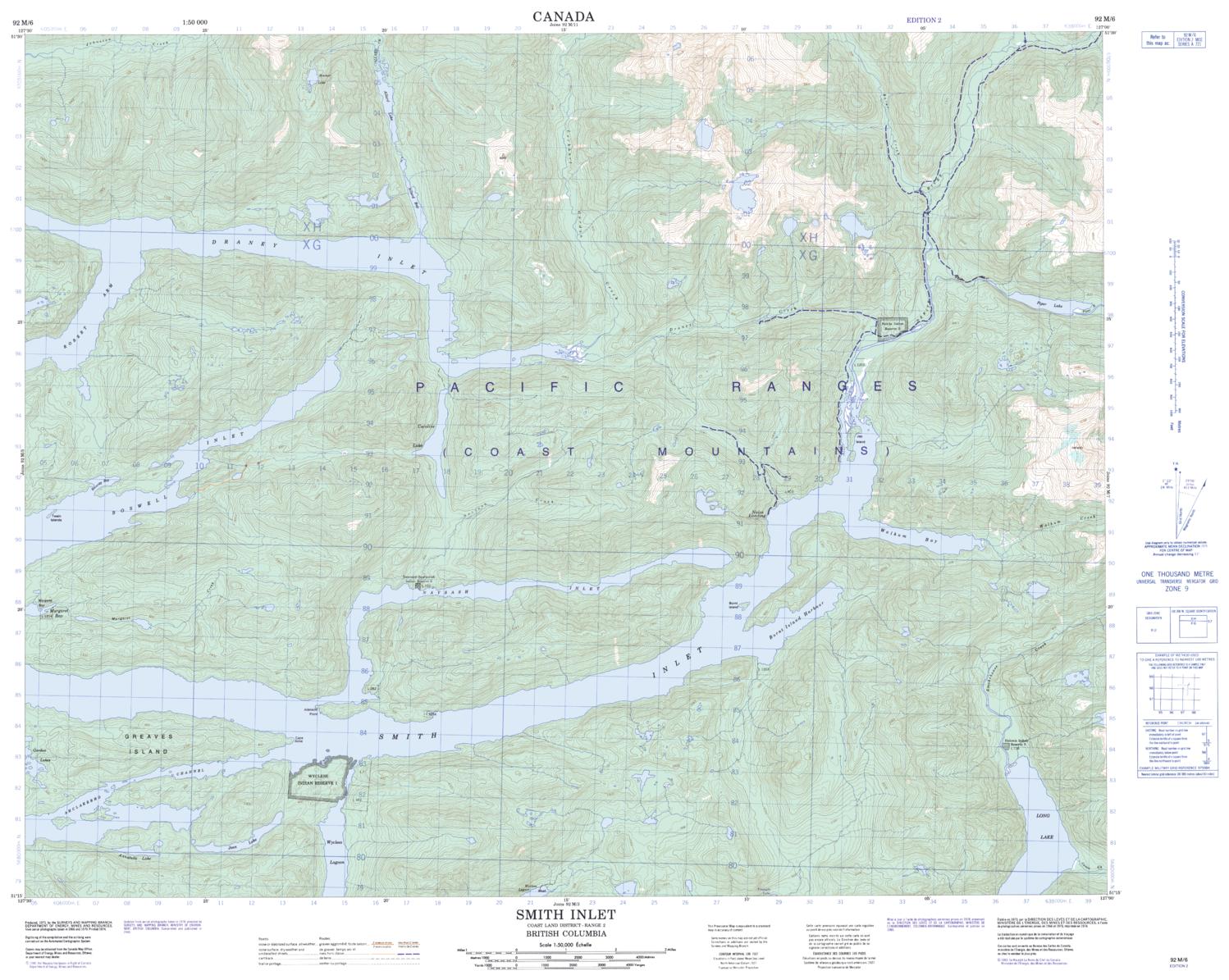 Canadian topographic map of Smith Inlet, British Columbia. NTS sheet 092M06 Edition 2.