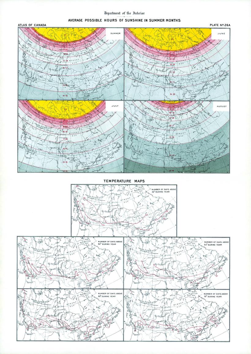 Contained within the 1st Edition (1906) of the Atlas of Canada is a plate that shows 9 maps. Four maps show the average possible hours of sunshine for Canada in the summer months. There is a map for June, July, and August, in addition to a map combining these months. In the northern portion of Canada there is considerably more sunshine during the summer months, than in the southern portions, but mainly in eastern Canada. As a result, wheat will mature in less time within Ontario, then in Edmonton or Calgary. The other five maps show the number of days during the year with temperatures above 32 degrees F (0 degrees C), 40 degrees F (4.4 degrees C), 50 degrees F (10 degrees C), 60 degrees F (15.6 degrees C) and 70 degrees F (21.1 degrees C). The temperature differences are indicated with solid or dashed red lines indicating the number of days each portion of Canada will experience above temperatures indicated. In some of the maps, major railway systems are shown.