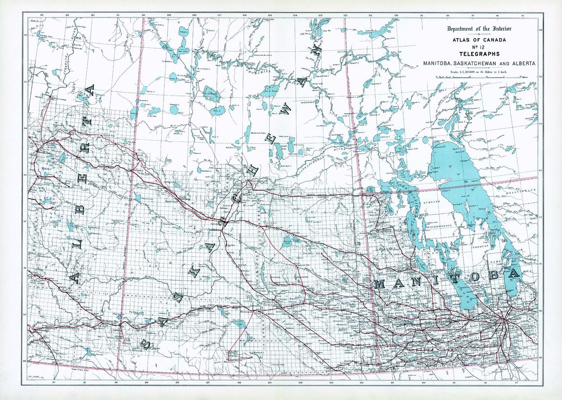 Contained within the 1st Edition (1906) Atlas of the Canada is a map that shows the telegraph network for Manitoba, Saskatchewan, and Alberta. Two or more lines may follow the same route, but only one line is indicated on the map. Therefore, well-settled portions of the country may have two or three telegraph lines serving the principal towns along each route indicated. Most telegraph lines follow alongside railway lines. Major cities, counties, rivers, major bodies of water and the railway systems are also included. The map displays the rectangular survey system which records the land that is available to the public. This grid like system is divided into sections, townships, range, and meridian from mid-Manitoba to Alberta.