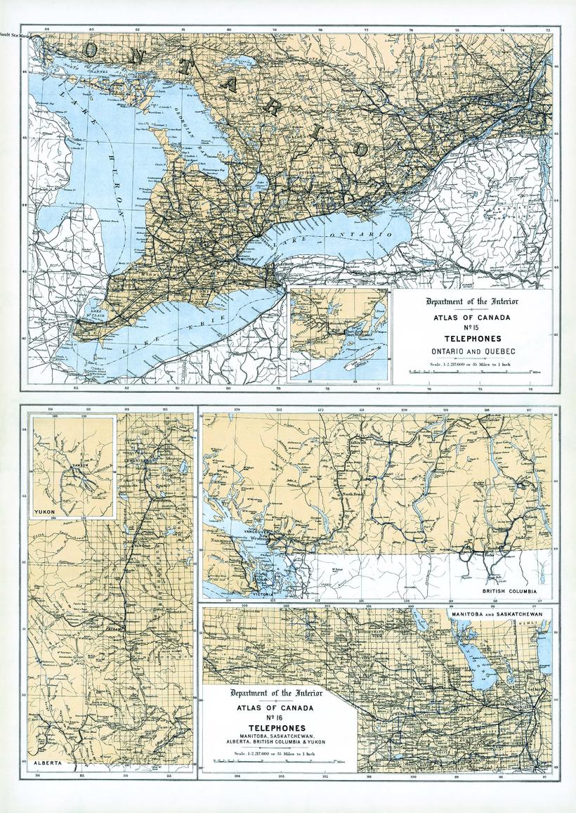 Contained within the 1st Edition (1906) of the Atlas of Canada is a plate that shows five maps. The maps show the telephone network for Ontario, Quebec, Manitoba, Saskatchewan, Alberta, British Columbia and Yukon. Two or more lines may follow the same route, but due to the scale of the map the inclusion of all the telephone lines in the vicinity of the larger cities and towns were not permitted. The telephone lines and their end nodes are represented as solid grey lines, and many lines follow alongside railway tracks. The map indicates the shore line portions of the various cable lines, the Pacific ocean in British Columbia, and inland waters in Alberta, central Saskatchewan, and Manitoba. Each segment is magnified into separate boundaries, and divided from one another. The maps includes major cities, counties, rivers, major bodies of water, and the railway systems running past the border and into part of the U.S.