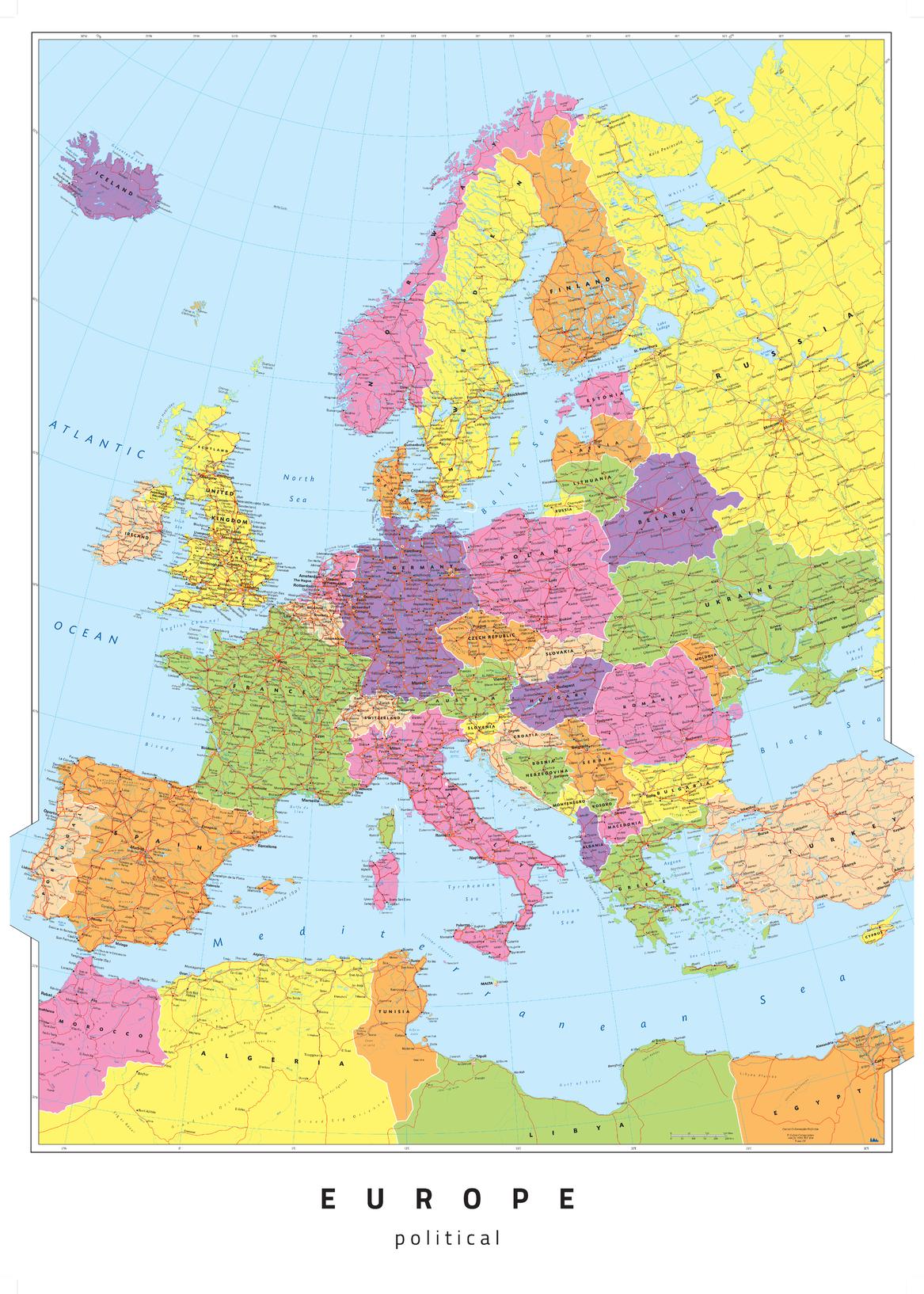 Europe map, politically colouredPage Size: 23.5 x 33.25 in (594 x 841 mm)