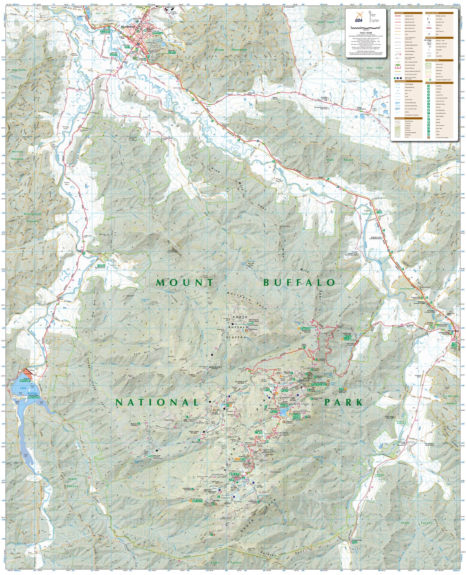 Outdoor Recreation Guide of Mount Buffalo National Park Alpine area in Victoria for Bushwalking, skiing, mountain biking and car touringPage Size: 32 x 39.5 in (810 x 1000 mm)