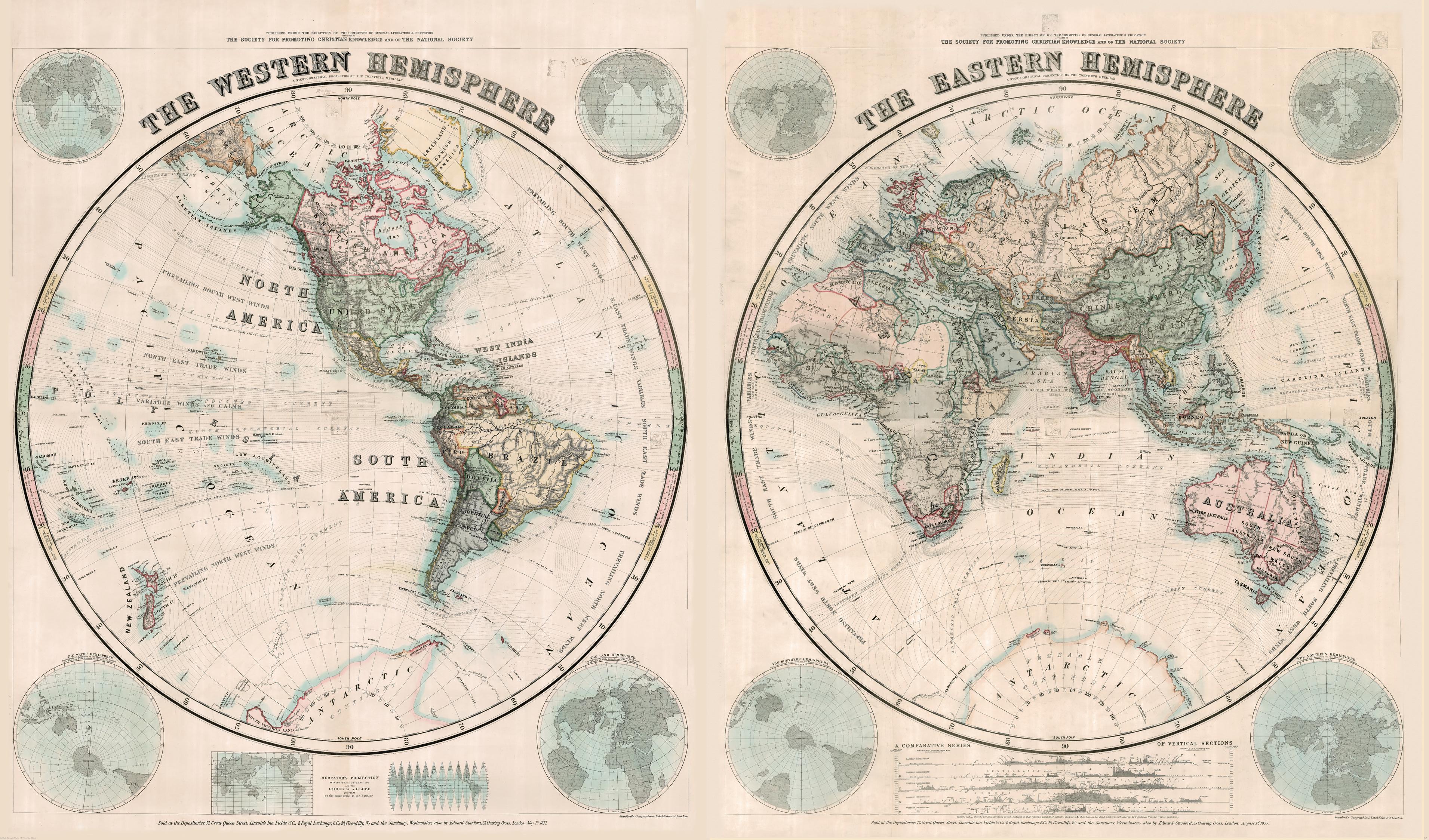 Stanford's Eastern and Western Hemispheres Map (1877) - Resized to 2A0 height