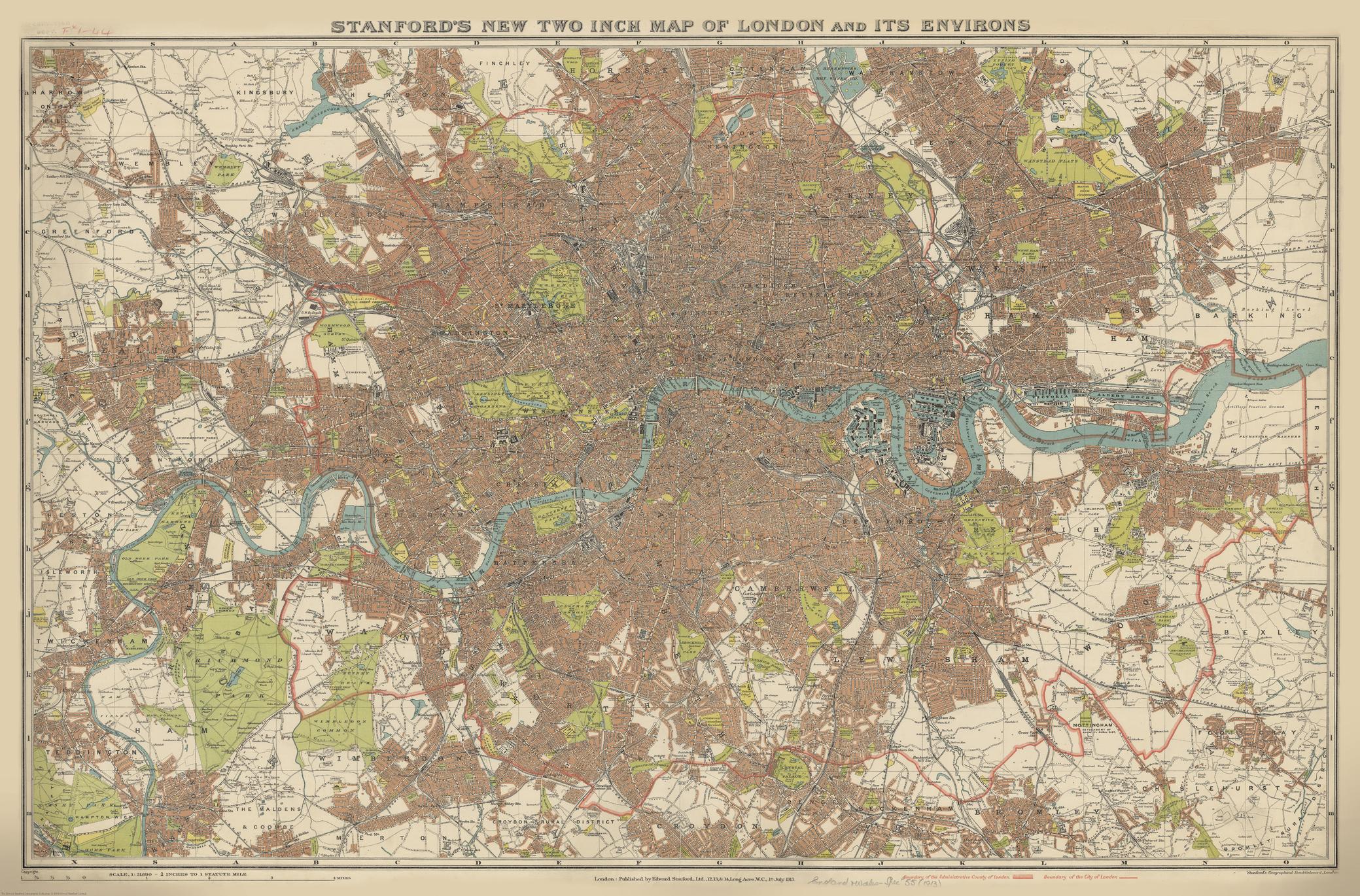 The Stanford’s New Two Inch Map of London is from a fascinating series of reproductions from our Edward Stanford Cartographic Collection archive.Page Size: 28.75 x 43.5 in (725 x 1100 mm)