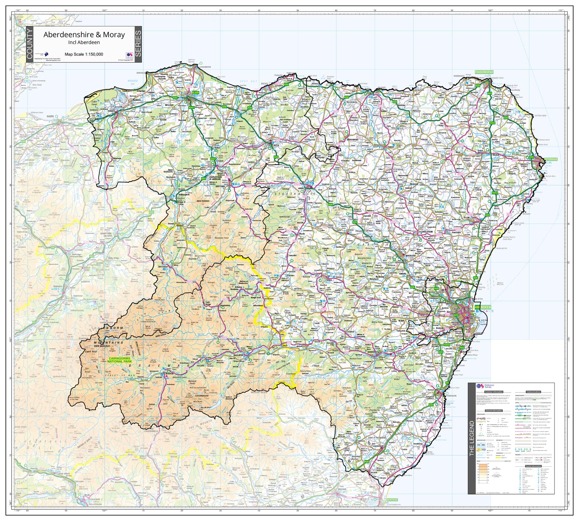 An Ordnance Survey Map covering the whole of the county showing the county boundary including applicable Unitary Authority boundaries. The mapping outside the county boundary is faded to highlight the county. Part of a series of counties maps that cover England Scotland & Wales all using the same background Ordnance Survey Mapping for continuity across the whole series. This map includes Aberdeen, Peterhead