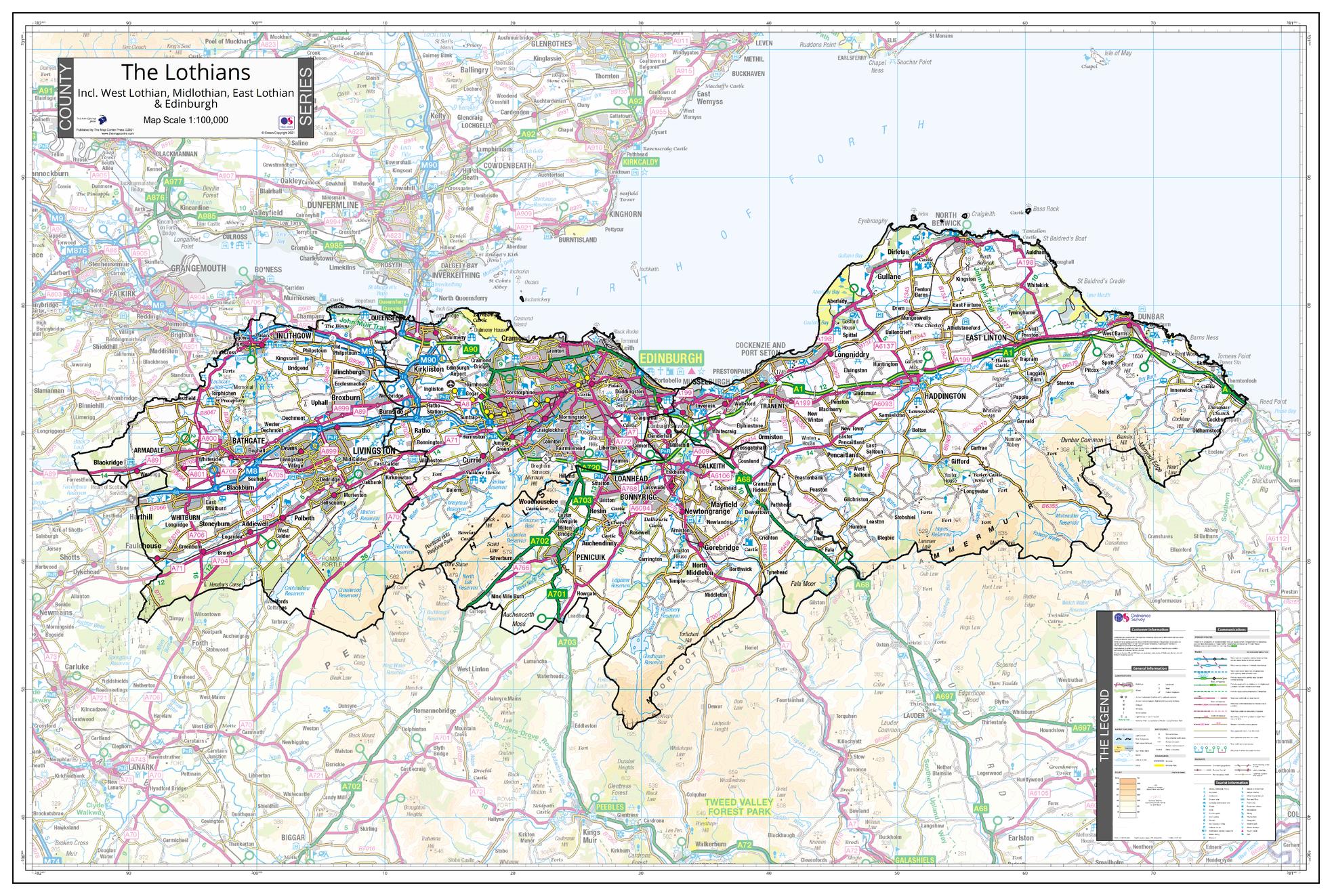 An Ordnance Survey Map covering the whole of the county showing the county boundary including applicable Unitary Authority boundaries. The mapping outside the county boundary is faded to highlight the county. Part of a series of counties maps that cover England Scotland & Wales all using the same background Ordnance Survey Mapping for continuity across the whole series. This map includes Edinburgh, Livingstone, Bathgate