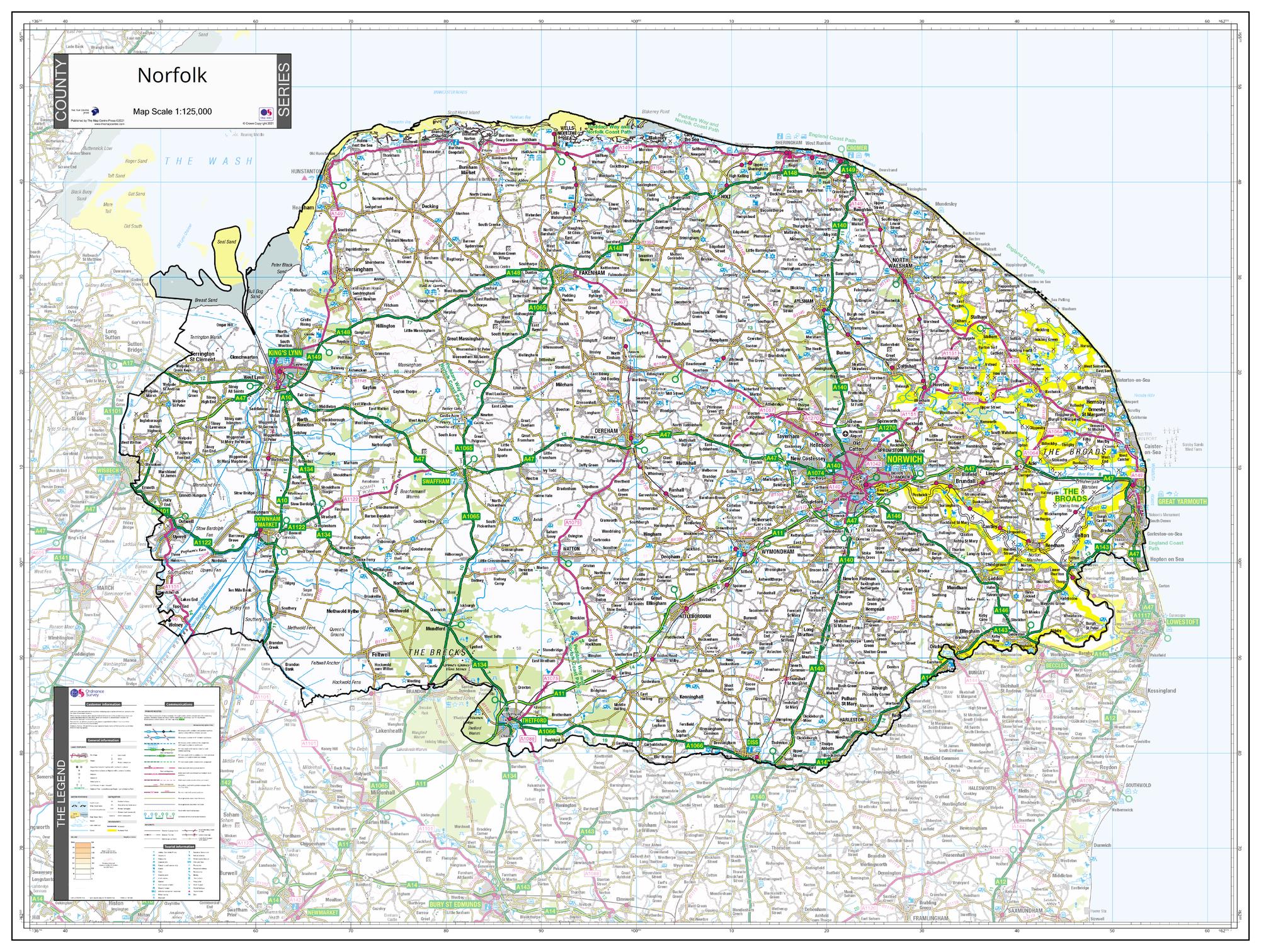 An Ordnance Survey Map covering the whole of the county showing the county boundary including applicable Unitary Authority boundaries. The mapping outside the county boundary is faded to highlight the county. Part of a series of counties maps that cover England Scotland & Wales all using the same background Ordnance Survey Mapping for continuity across the whole series. This map includes Norwich, Great Yarmouth