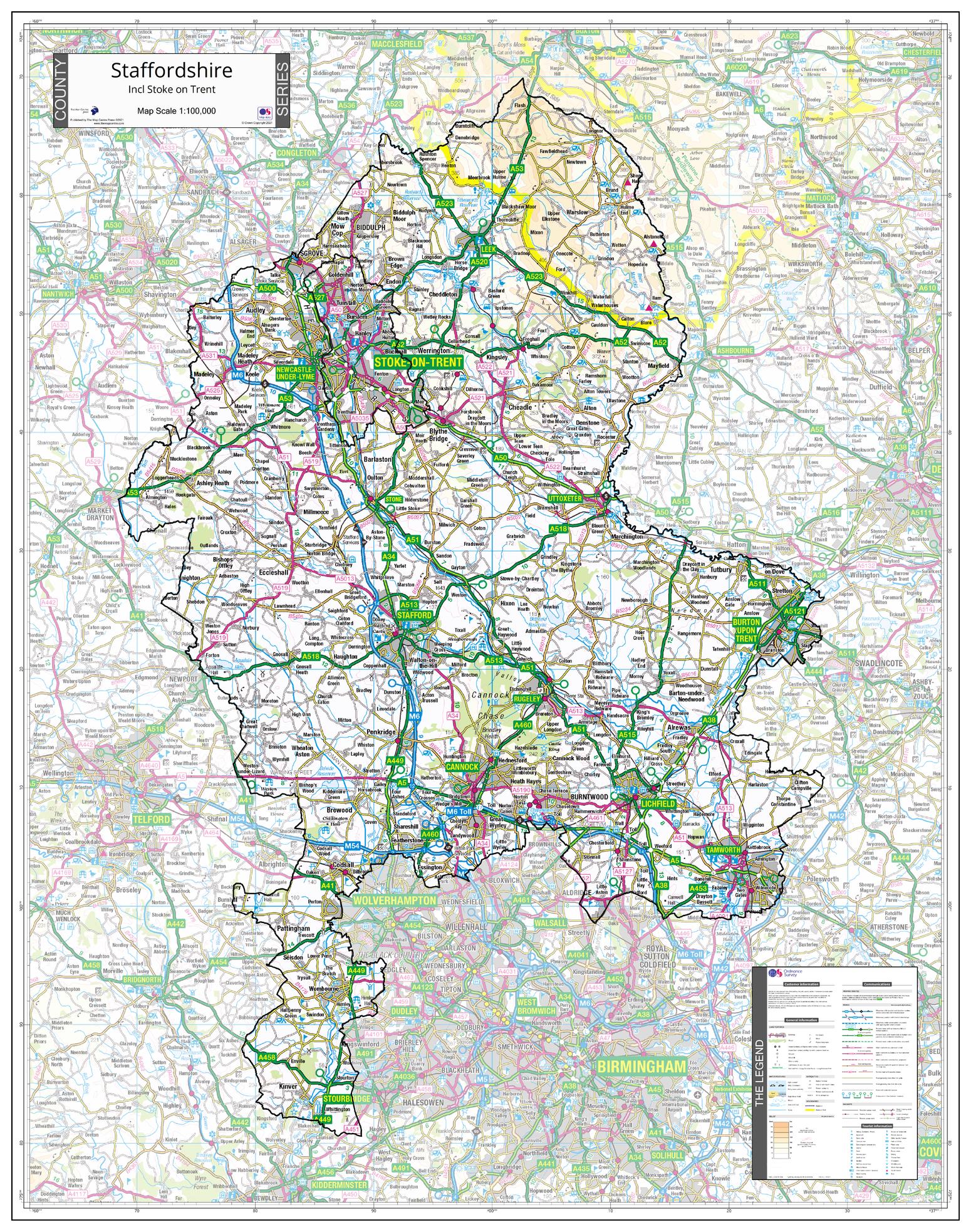An Ordnance Survey Map covering the whole of the county showing the county boundary including applicable Unitary Authority boundaries. The mapping outside the county boundary is faded to highlight the county. Part of a series of counties maps that cover England Scotland & Wales all using the same background Ordnance Survey Mapping for continuity across the whole series. This map includes Stafford, Utoxeter, Stoke on Trent