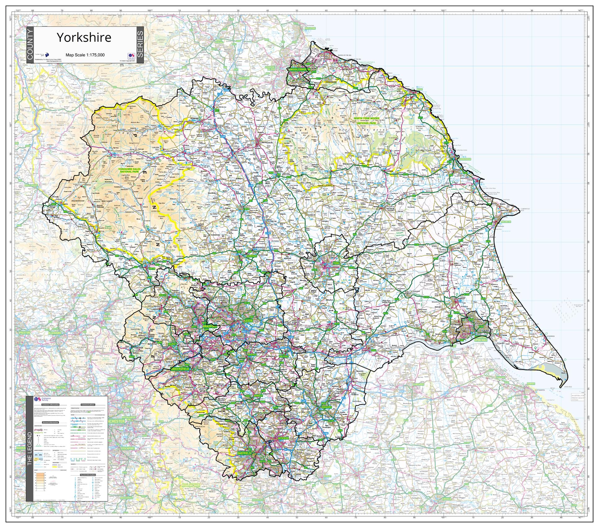 An Ordnance Survey Map covering the whole of the county showing the county boundary including applicable Unitary Authority boundaries. The mapping outside the county boundary is faded to highlight the county. Part of a series of counties maps that cover England Scotland & Wales all using the same background Ordnance Survey Mapping for continuity across the whole series. This map includes North Riding, East Riding, South Riding, West Riding, Leeds, York, Harrogate, Sheffield, Hull, Bradford, Halifax