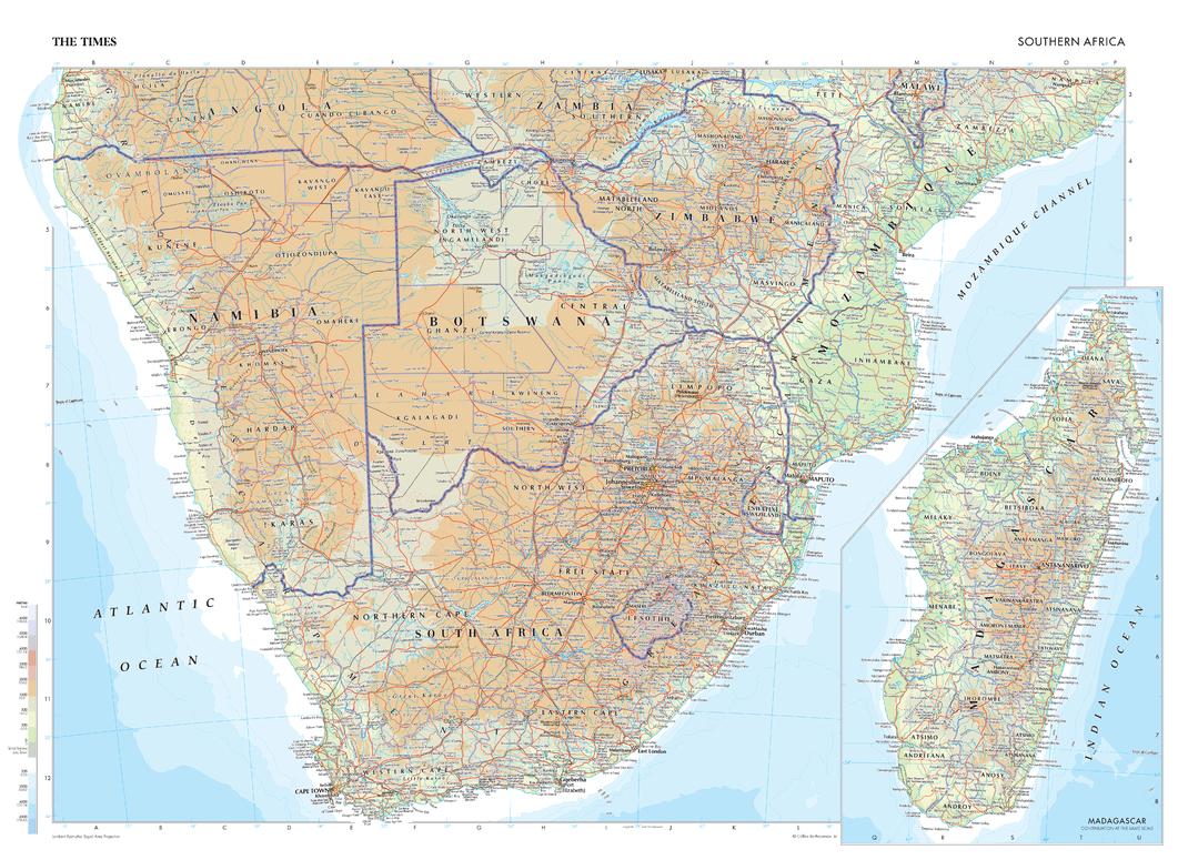 This map of Southern Africa is a benchmark of cartographic excellence, taken from the industry leading Times Comprehensive Atlas of the World. Zimbabwe, Botswana, Mozambique, Swaziland, Namibia, and South Africa are covered in full, with Angola, Zambia, and Malawi partially covered. Capital cities of Windhoek, Harare, Maputo, Cape Town, Gaborone, and Antananarivo are clearly marked, as are geographical features such as the Namib desert. International borders are visibly marked, as are regional and state boundaries within the countries. Inset map provides additional views of Madagascar. Each element is carefully chosen to make the map a coherent and attractive visual guide to Southern Africa.