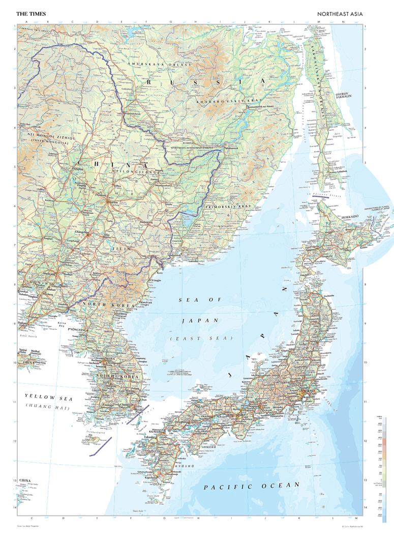 This map of Northeast Asia is a benchmark of cartographic excellence, taken from the industry leading Times Comprehensive Atlas of the World. With its full colour presentation, this thoroughly updated map provides an encompassing view of the Northeast Asian region. With full coverage of Japan, South Korea, and North Korea, and additional mapping covering east China and Russia, this map offers a clear representation of this region of the world. Key urban centres such as Beijing, Tokyo, Seoul, and Pyongyang, are all clearly identifiable, contributing to the intricate landscape of Northeast Asia. Carefully curated to ensure both coherence and attractiveness, every element of this map contributes to its role as an essential guide to the geography of Northeast Asia.