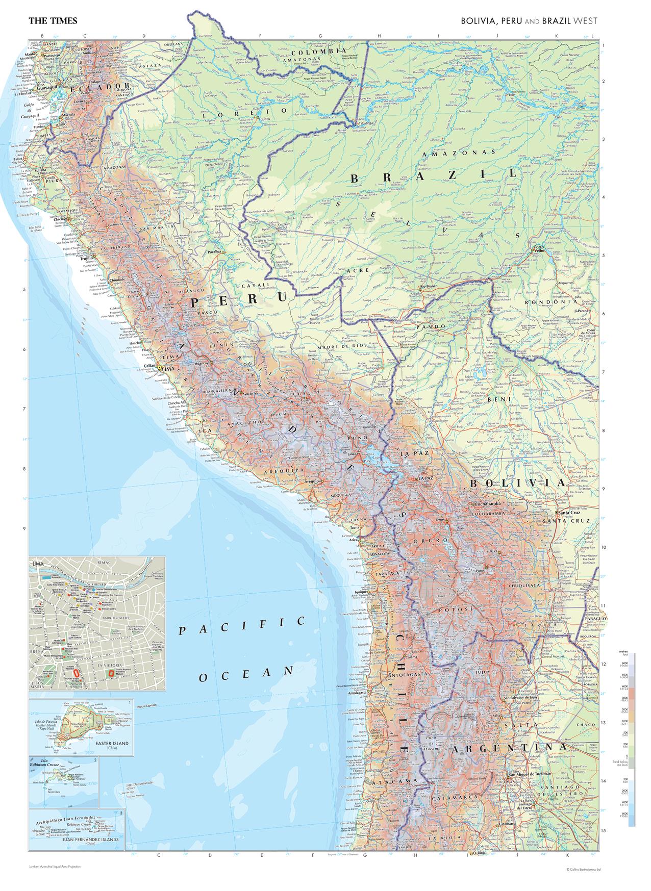 This map of Bolivia, Peru, and Brazil's Western region stands as a benchmark of cartographic excellence, sourced from the industry-leading Times Comprehensive Atlas of the World. Published in full colour, this map offers a comprehensive and updated view of the diverse landscapes and attractions that characterise this area. This map includes prominent features such as the Andes mountains, Amazon rainforest, key cities, and landmarks. Additional mapping covers parts of Chile, Argentina and Ecuador. Notably, the map also includes a city plan inset of Lima, providing an extra layer of detail to this historic capital. With meticulous attention to detail, this map is an indispensable guide to the geographic intricacies and highlights of Bolivia, Peru, and Brazil's Western region.