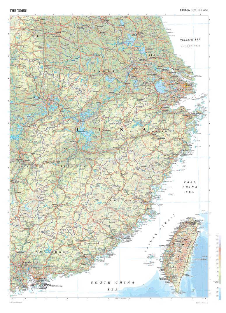 This map of China's Southeast regions stands as a benchmark of cartographic excellence, sourced from the industry-leading Times Comprehensive Atlas of the World. Published in full colour, this map offers a comprehensive and updated view of the diverse landscapes that characterise this area. Prominent features such as the island nation of Taiwan and key cities such as Shanghai, Wuhan and Guangzhou are clearly identifiable. With meticulous attention to detail, this map is an indispensable guide to the geographic and urban intricacies of China's Southeast regions.