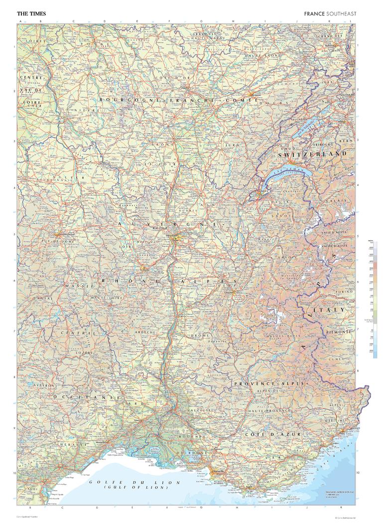 This map of France's Southeast region stands as a benchmark of cartographic excellence, sourced from the industry-leading Times Comprehensive Atlas of the World. Published in full colour, this map offers a comprehensive and updated view of the landscapes found this region. Prominent features such as the southern coastline, the alps, and key cities such as Lyon, Marseille and Nice are clearly identifiable. With meticulous attention to detail, this map is an indispensable guide to the geographic intricacies of France's Southeast.