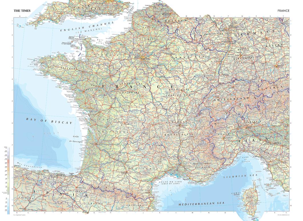 This map of France is a benchmark of cartographic excellence, taken from the industry leading Times Comprehensive Atlas of the World. There is a high level of detail packed into the map, yet the positioning of every element is carefully chosen to make the map coherent and attractive. Major cities including Lyon and Marseille are easily identifiable, as is the capital, Paris. International borders are clearly marked as are regional boundaries within France. Supplementary mapping covers Switzerland, northern Italy, Spain, western Germany and southern England. The island region of Corse (Corsica) is also fully visible. Geographical features such as the Alps and the Pyrenees Mountain range are also marked.