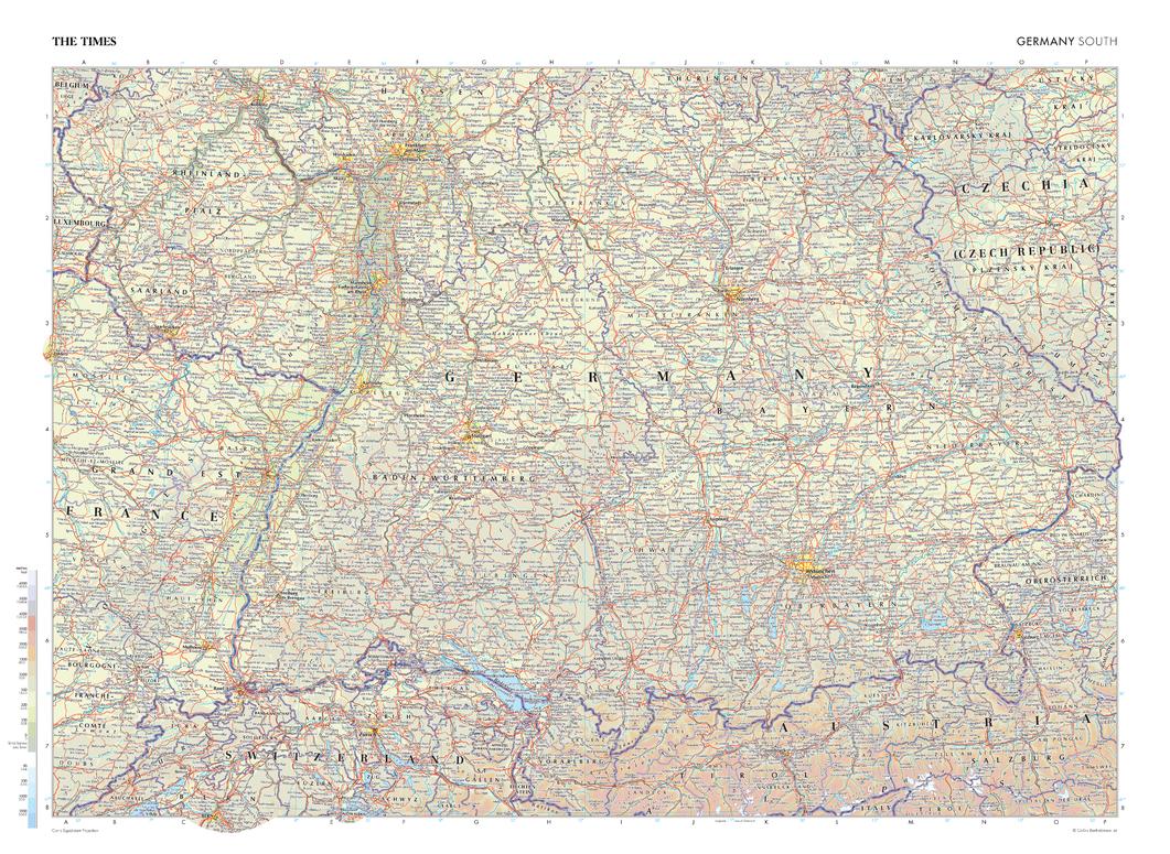 This map of Germany's southern regions stands as a benchmark of cartographic excellence, sourced from the industry-leading Times Comprehensive Atlas of the World. Published in full colour, this map offers a comprehensive and updated view of the landscapes that make up this area. Prominent features such as the winding Rhine River, the historic cities of Munich and Stuttgart, and key landmarks are clearly identifiable. With meticulous attention to detail, this map is an indispensable guide to the geographic intricacies of southern Germany.