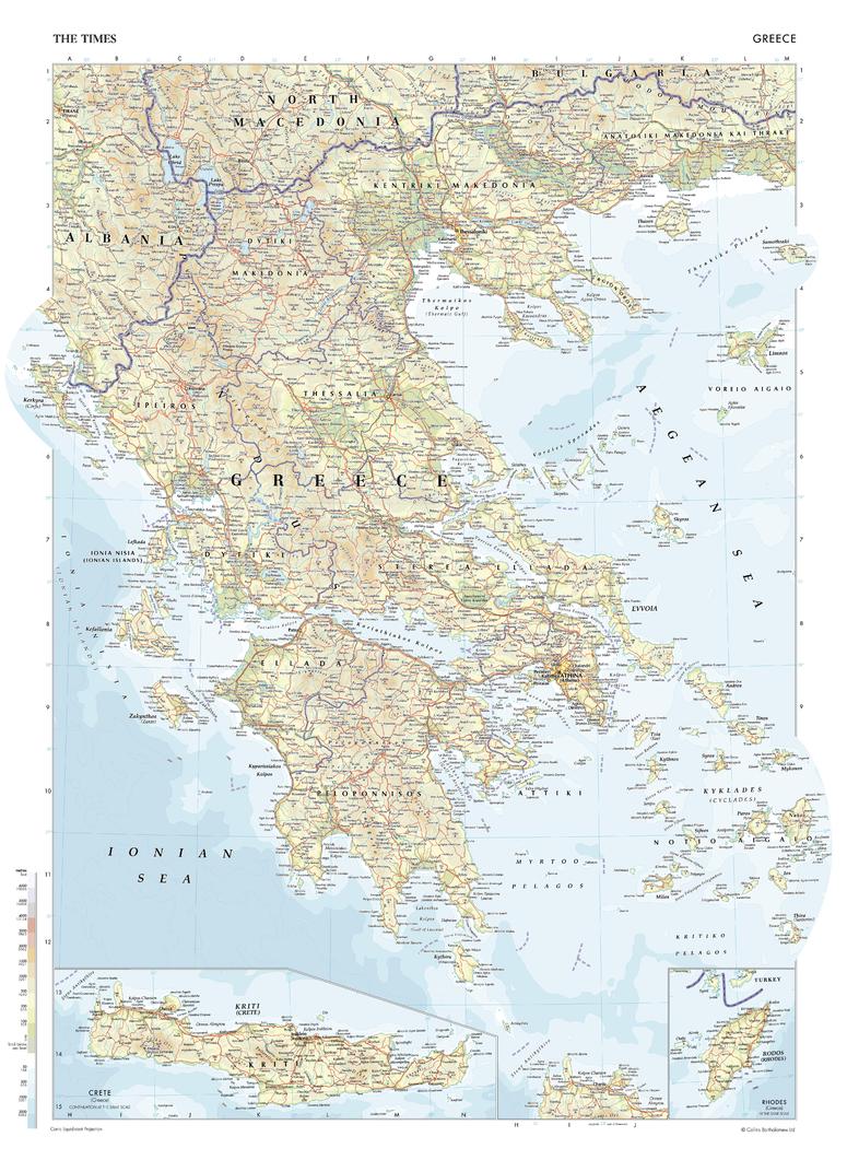 This map of Greece is a benchmark of cartographic excellence, taken from the industry leading Times Comprehensive Atlas of the World. There is a high level of detail packed into the map, yet the positioning of every element is carefully chosen to make the map coherent and attractive. Major cities such as Thessaloniki are easily identifiable, as is the capital, Athina (Athens). International borders are clearly marked as are regional boundaries within Greece, and geographical features, such as the Peloponnesian mountains. Additional inset maps provide detailed views of the islands of Crete and Rhodes. Each element is carefully chosen to make the map a coherent and attractive visual guide to Greece.