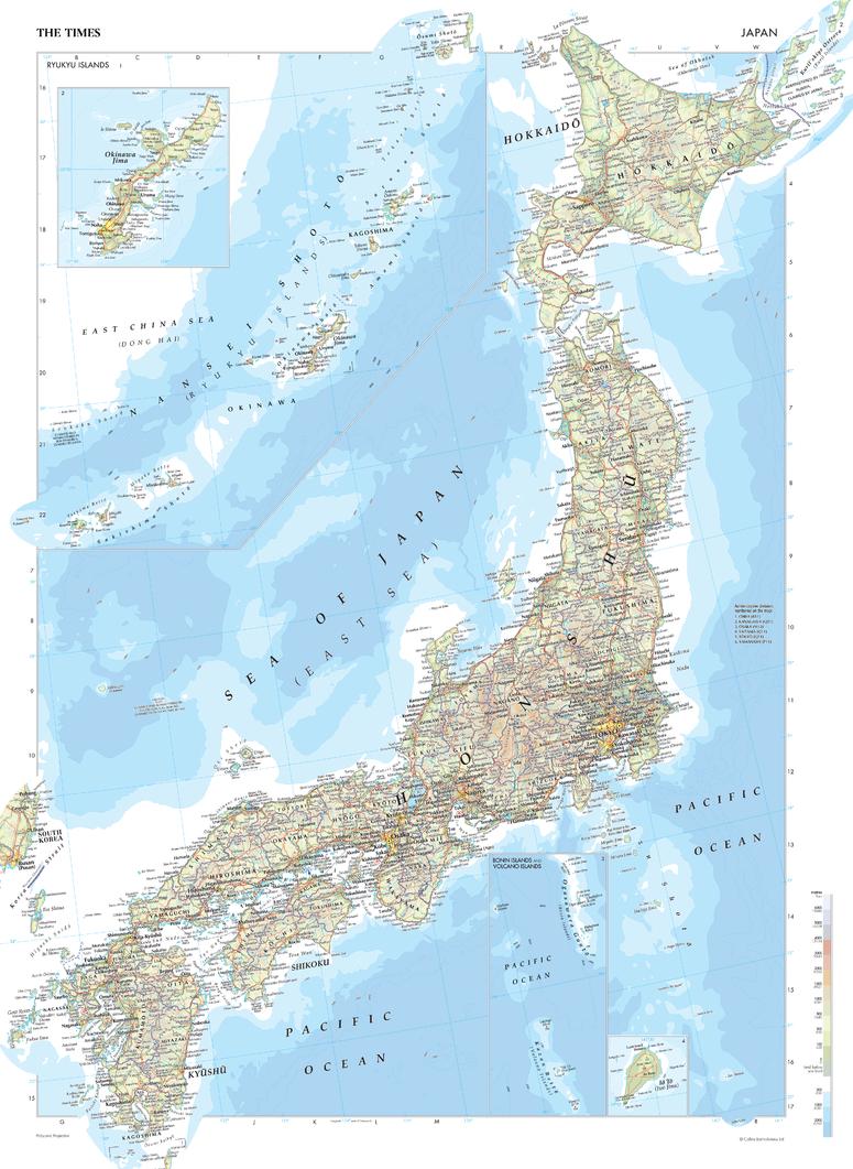This map of Japan is a benchmark of cartographic excellence, taken from the industry leading Times Comprehensive Atlas of the World. Alongside the main islands of Hokkaido, Honshu, Shikoku, Kyushu, and Okinawa, the many other islands that make up Japan are easily identifiable. Additional inset maps of the Ryukya Islands and the Bonin Islands and Volcano Islands are expanded upon by further insets showing the islands of Okinawa and Iō Tō. Major cities of Osaka and Nagoya are easily identifiable, as is the capital, Tokyo. Each element is carefully chosen to make the map a coherent and attractive visual guide to Japan.