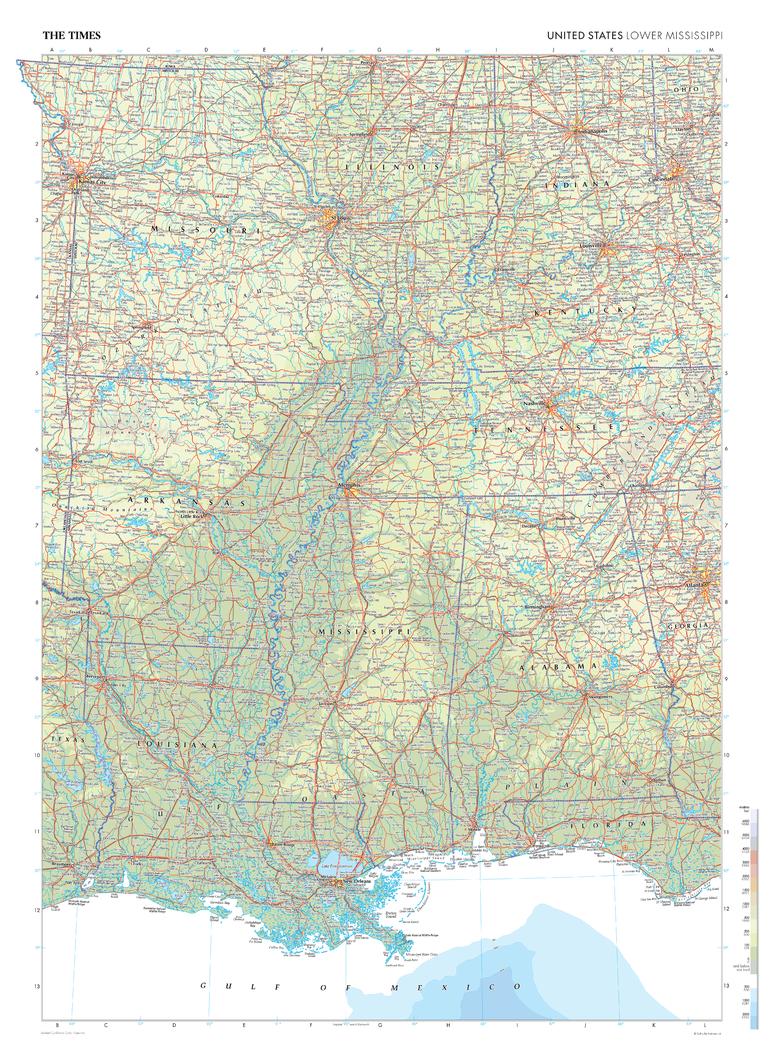 This map of the US Lower Mississippi region stands as a benchmark of cartographic excellence, sourced from the industry-leading Times Comprehensive Atlas of the World. Published in full colour, this map offers a comprehensive and updated view of the diverse landscapes and cultures that define this area. Encompassing states such as Louisiana, Mississippi, Arkansas, Tennessee, Alabama and more, this map includes prominent features such as the iconic Mississippi River, and the cities of New Orleans, Memphis, and St Louis. With meticulous attention to detail, this map is an indispensable guide to the geographic intricacies of the US Lower Mississippi region.