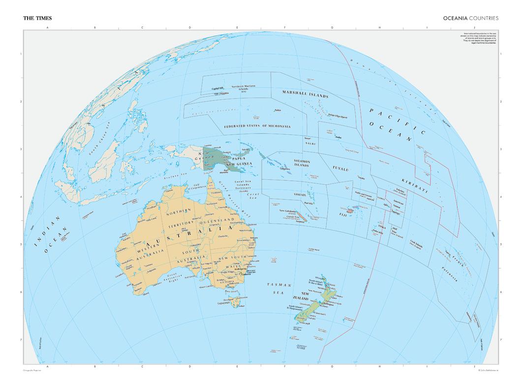 This map of Oceania's political features is a benchmark of cartographic excellence, taken from the industry leading Times Comprehensive Atlas of the World series. Showing the full extent of Oceania with clearly marked international boundaries detailing Island and Island Group ownership. Australia, New Zealand, and New Guinea are all clearly identifiable, as are the numerous island groups within this area, including: Solomon Islands, Federated States of Micronesia and Fiji. Each element is carefully chosen to make the map a coherent and attractive visual guide to Oceania's political features.
