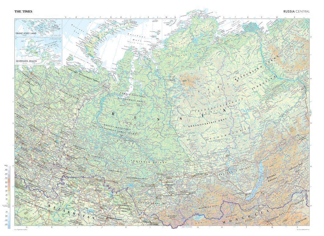 This map of Russia's central region stands as a benchmark of cartographic excellence, sourced from the industry-leading Times Comprehensive Atlas of the World. Published in full colour, this map offers a comprehensive and updated view of the vast landscapes that appear in this region. Additional inset maps of Franz Josef Land and Severnaya Zemlya also provide further detail. With meticulous attention to detail, this map is an indispensable guide to the geographic intricacies of Russia's Central region.