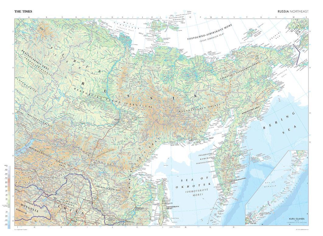 This map of Russia's north-eastern regions stands as a benchmark of cartographic excellence, sourced from the industry-leading Times Comprehensive Atlas of the World. Published in full colour, this map offers a comprehensive and updated view of the landscapes that make up this region. Prominent features such as the vast Siberian wilderness and the varied coastline along the Sea of Okhotsk are clearly identifiable, while an inset map of the Kuril Islands provides a more detailed view of this area. With meticulous attention to detail, this map is an indispensable guide to the geographic intricacies of the Russia's northeast.