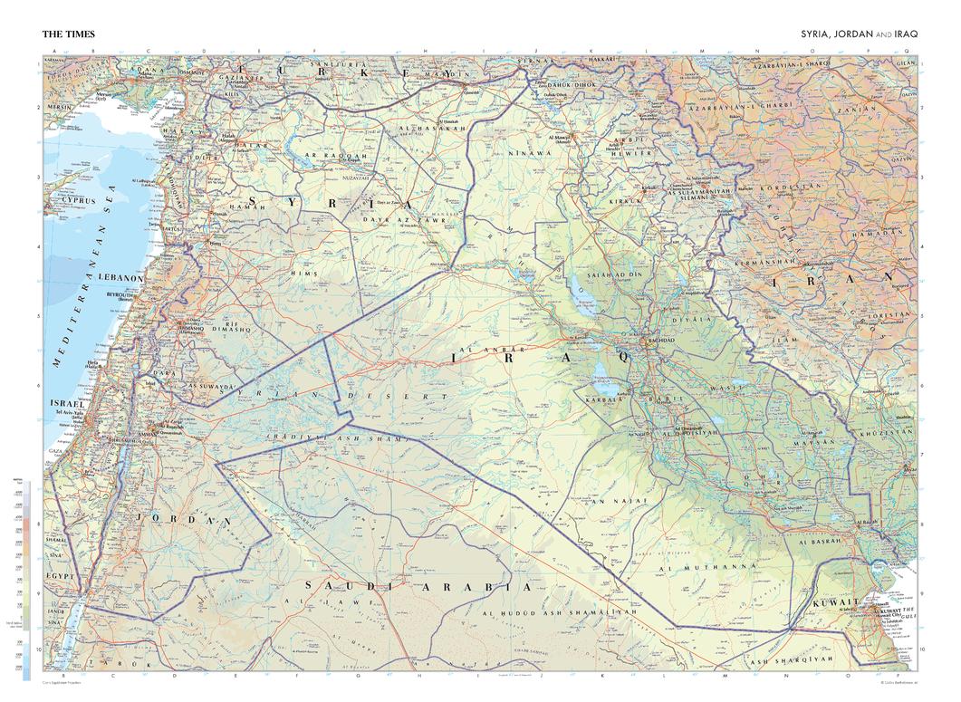 This map of Syria, Jordan, and Iraq stands as a benchmark of cartographic excellence, sourced from the industry-leading Times Comprehensive Atlas of the World. Published in full colour, this map offers a comprehensive and updated view of the geography of this region. Prominent features such as the historic cities of Jerusalem and Baghdad, the Mediterranean Coast and the Syrian Desert can all be easily identified. Iran, Saudi Arabia, Kuwait, Israel, and Lebanon also feature. With meticulous attention to detail, this map is an indispensable guide to the geographic intricacies of Syria, Jordan, and Iraq.
