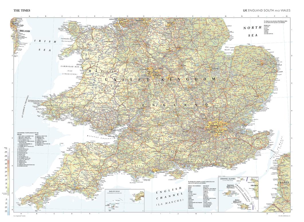 This map of South England and Wales stands as a benchmark of cartographic excellence, sourced from the industry-leading Times Comprehensive Atlas of the World. Published in full colour, extending from Cornwall to Sheffield, Norfolk to Pembrokeshire, this map offers a comprehensive and updated view of the landscapes that feature in this region. Notably, the map includes insets featuring the Channel Islands and the Isles of Scilly, adding an extra layer of detail to these regions. With meticulous attention to detail, this map is an indispensable guide to the geographic intricacies of South England and Wales.