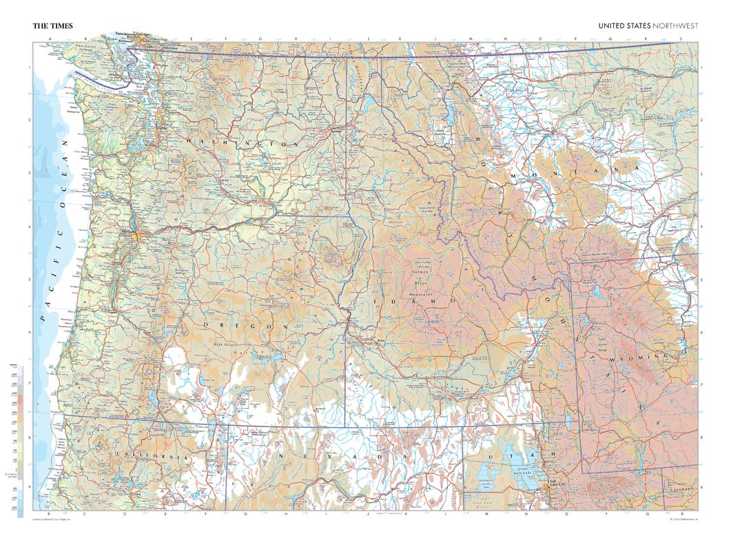 This map of the US Northwest stands as a benchmark of cartographic excellence, sourced from the industry-leading Times Comprehensive Atlas of the World. Published in full colour, this map offers a comprehensive and updated view of the landscapes that are found in this region. Encompassing states such as Washington, Montana, Oregon, Idaho, and more, this map includes prominent features such as the Pacific Ocean coastline, Rocky Mountains, and iconic cities including: Seattle, Portland, and Salt Lake City. With meticulous attention to detail, this map is an indispensable guide to the geographic intricacies of the Northwest US.