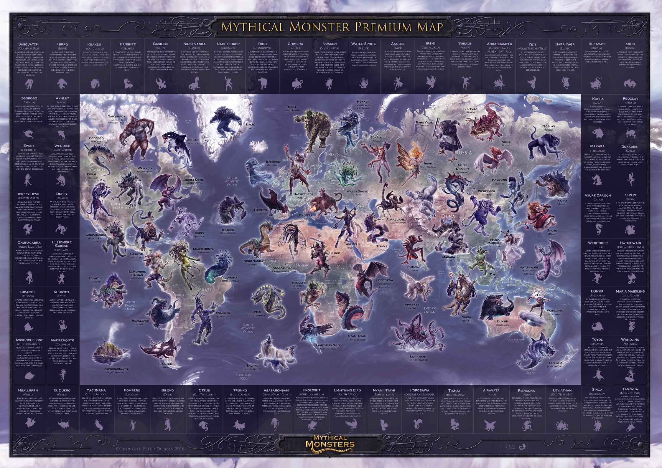 The Mythical Monster Map was created by Peter Dobbin, a renowned UK artist. The stunning monster images portrayed on a map of the world bring life to myths and legends that have emerged around the planet.