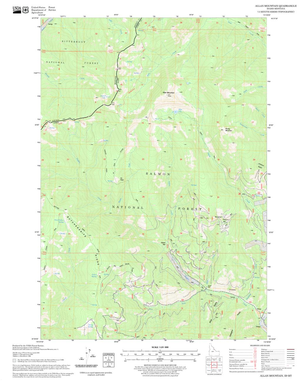 United States Department of Agriculture Forestry Service topographical map of Allan Mountain, Salmon-Chalis National Forest, Idaho.