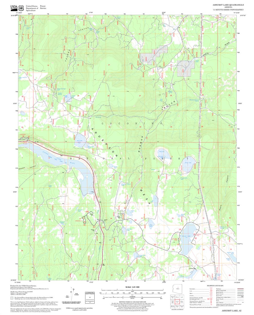 United States Department of Agriculture Forestry Service topographical map of Ashurst Lake, Coconino National Forest, Arizona.