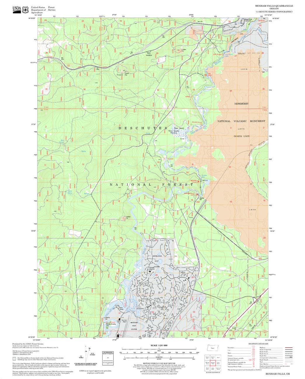 United States Department of Agriculture Forestry Service topographical map of Benham Falls, Deschutes National Forest, Oregon.