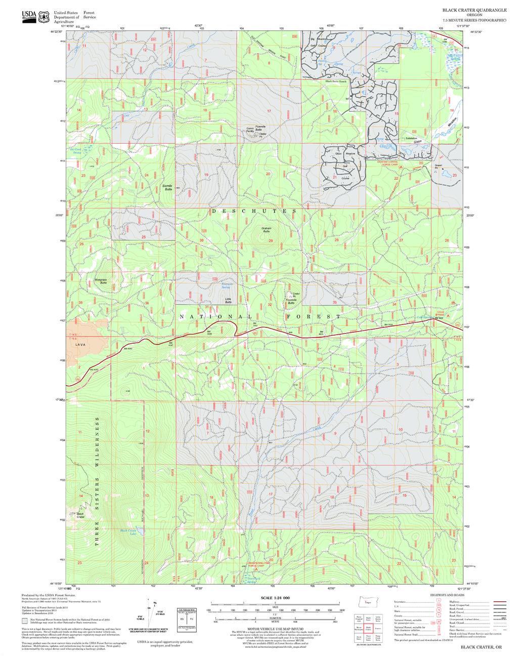 United States Department of Agriculture Forestry Service topographical map of Black Crater, Deschutes National Forest, Oregon.