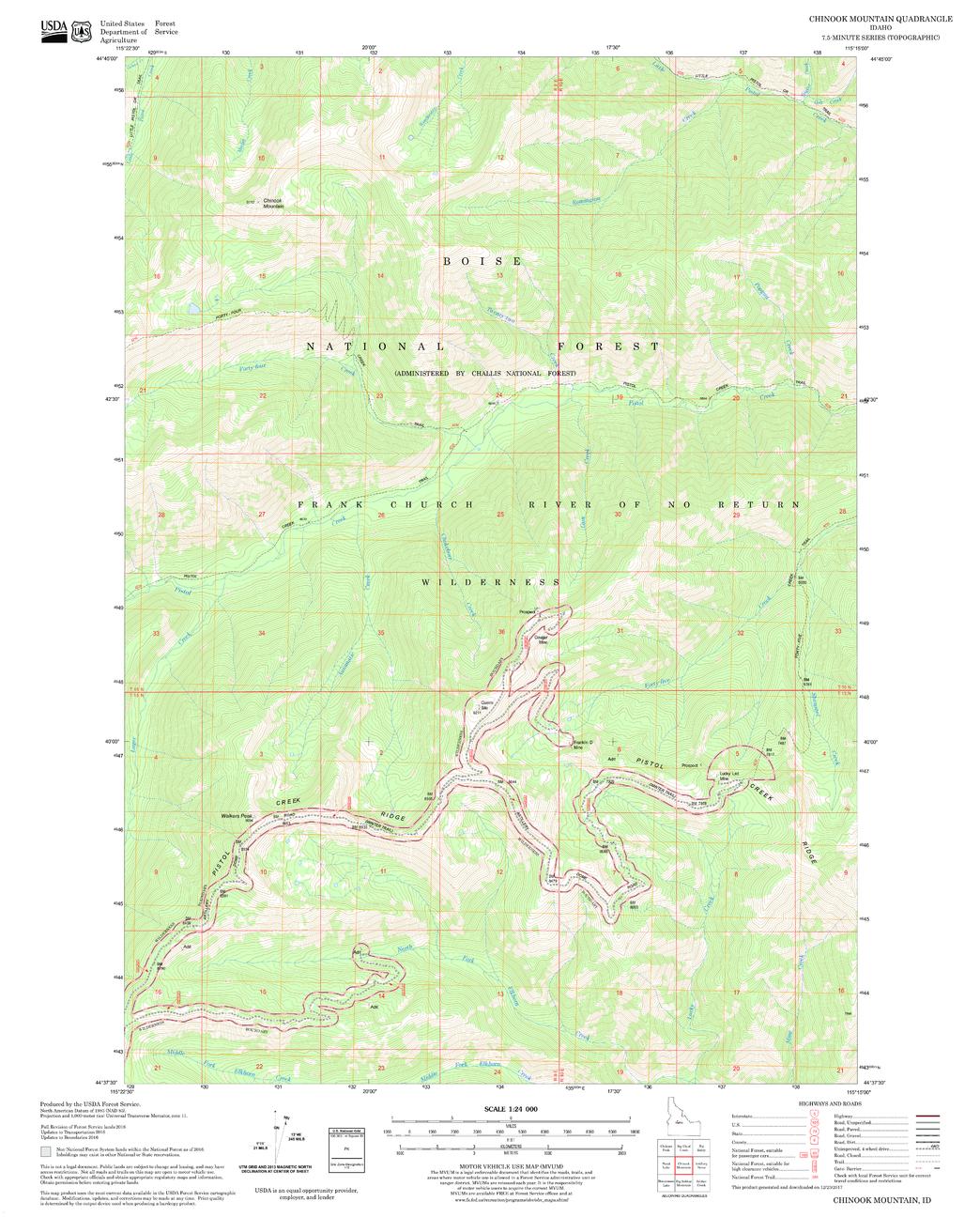 United States Department of Agriculture Forestry Service topographical map of Chinook Mountain, Salmon-Chalis National Forest, Idaho.