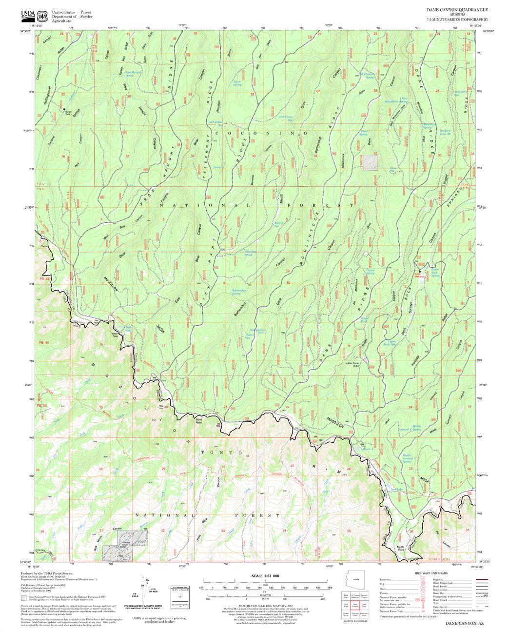 United States Department of Agriculture Forestry Service topographical map of Dane Canyon, Coconino National Forest, Arizona.