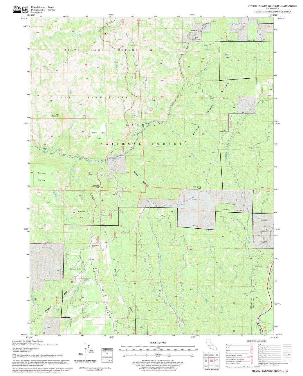 United States Department of Agriculture Forestry Service topographical map of Devils Parade Ground, Lassen National Forest, California.
