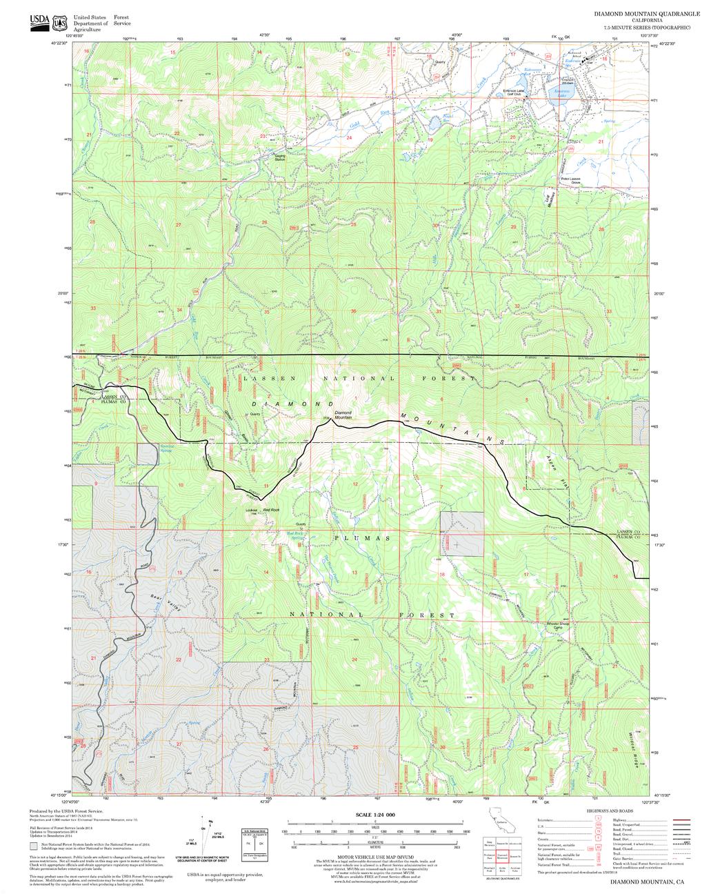 United States Department of Agriculture Forestry Service topographical map of Diamond Mountain, Lassen National Forest, California.