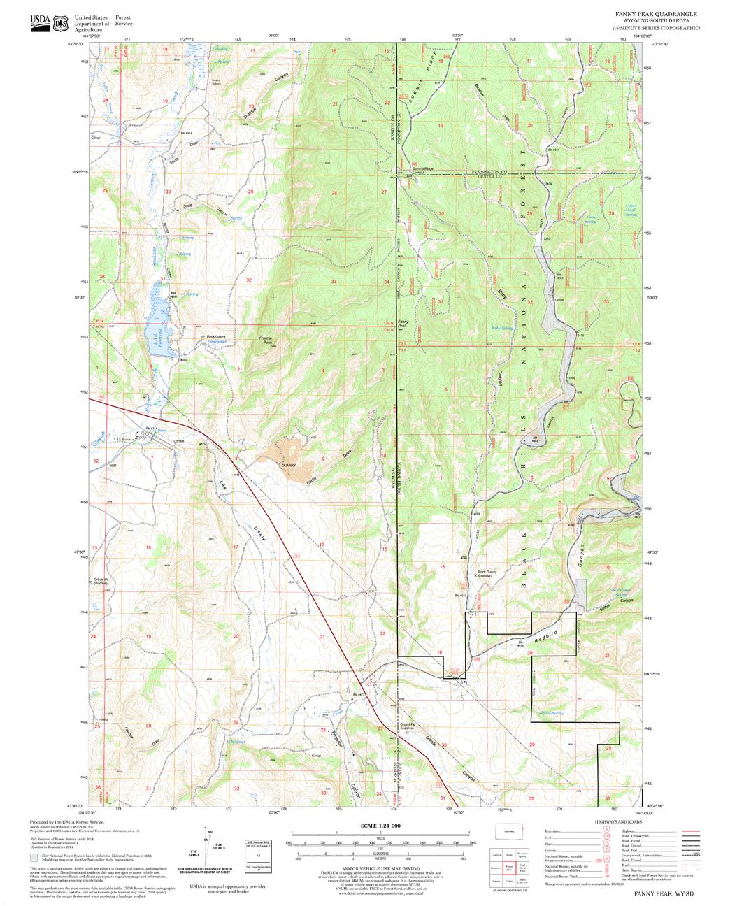 United States Department of Agriculture Forestry Service topographical map of Fanny Peak, Black Hills National Forest, South Dakota.