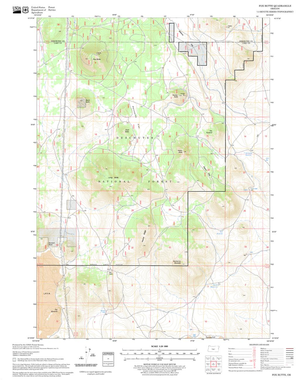 United States Department of Agriculture Forestry Service topographical map of Fox Butte, Deschutes National Forest, Oregon.